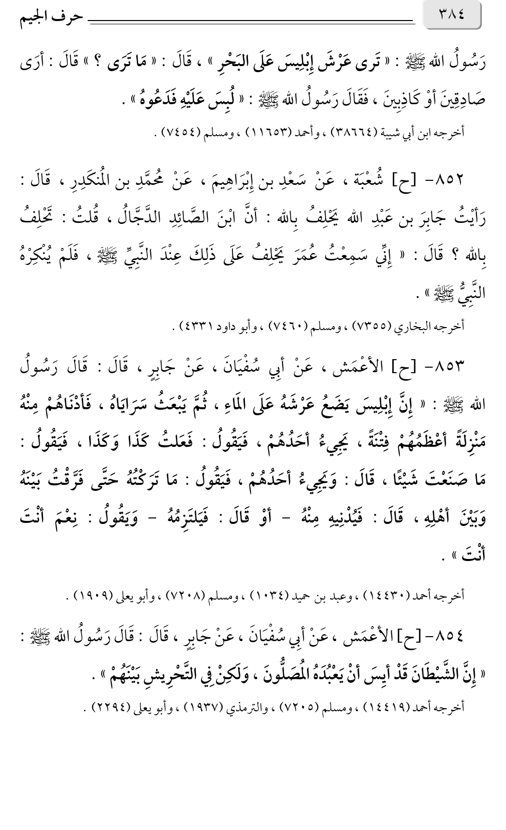 ٨٥٣ - [ح] الأعْمَش، عَنْ أبِي سُفْيَانَ، عَنْ جَابِرٍ، قَالَ: قَالَ رَسُولُ الله صلى الله عليه وسلم: «إِنَّ إِبْلِيسَ يَضَعُ عَرْشَهُ عَلَى المَاءِ، ثُمَّ يَبْعَثُ سَرَايَاهُ، فَأدْنَاهُمْ مِنْهُ مَنْزِلَةً أعْظَمُهُمْ فِتْنَةً، يَجِيءُ أحَدُهُمْ، فَيَقُولُ: فَعَلتُ كَذَا وَكَذَا، فَيَقُولُ: مَا صَنَعْتَ شَيْئًا، قَالَ: وَيَجِيءُ أحَدُهُمْ، فَيَقُولُ: مَا تَرَكْتُهُ حَتَّى فَرَّقْتُ بَيْنَهُ وَبَيْنَ أهْلِهِ، قَالَ: فَيُدْنِيهِ مِنْهُ - أوْ قَالَ: فَيَلتَزِمُهُ - وَيَقُولُ: نِعْمَ أنْتَ أنْتَ».
