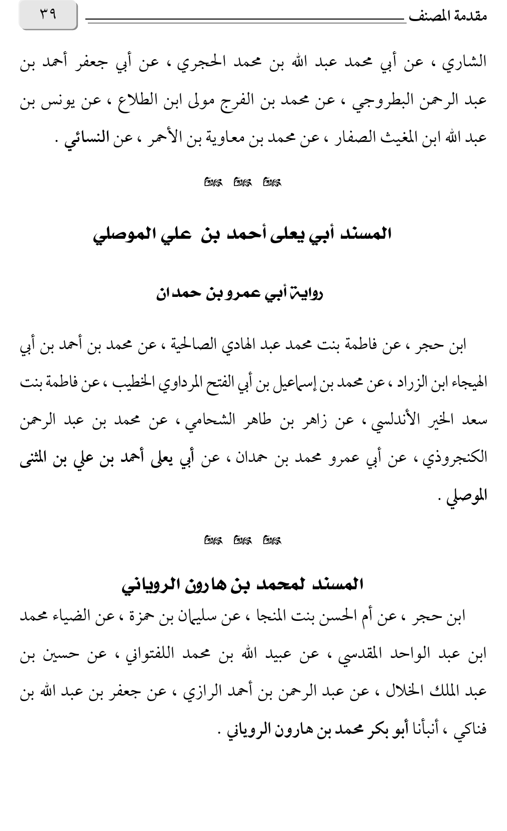 ابن حجر، عن فاطمة بنت محمد عبد الهادي الصالحية، عن محمد بن أحمد بن أبي الهيجاء ابن الزراد، عن محمد بن إسماعيل بن أبي الفتح المرداوي الخطيب، عن فاطمة بنت سعد الخير الأندلسي، عن زاهر بن طاهر الشحامي، عن محمد بن عبد الرحمن الكنجروذي، عن أبي عمرو محمد بن حمدان، عن أبي يعلى أحمد بن علي بن المثنى الموصلي.