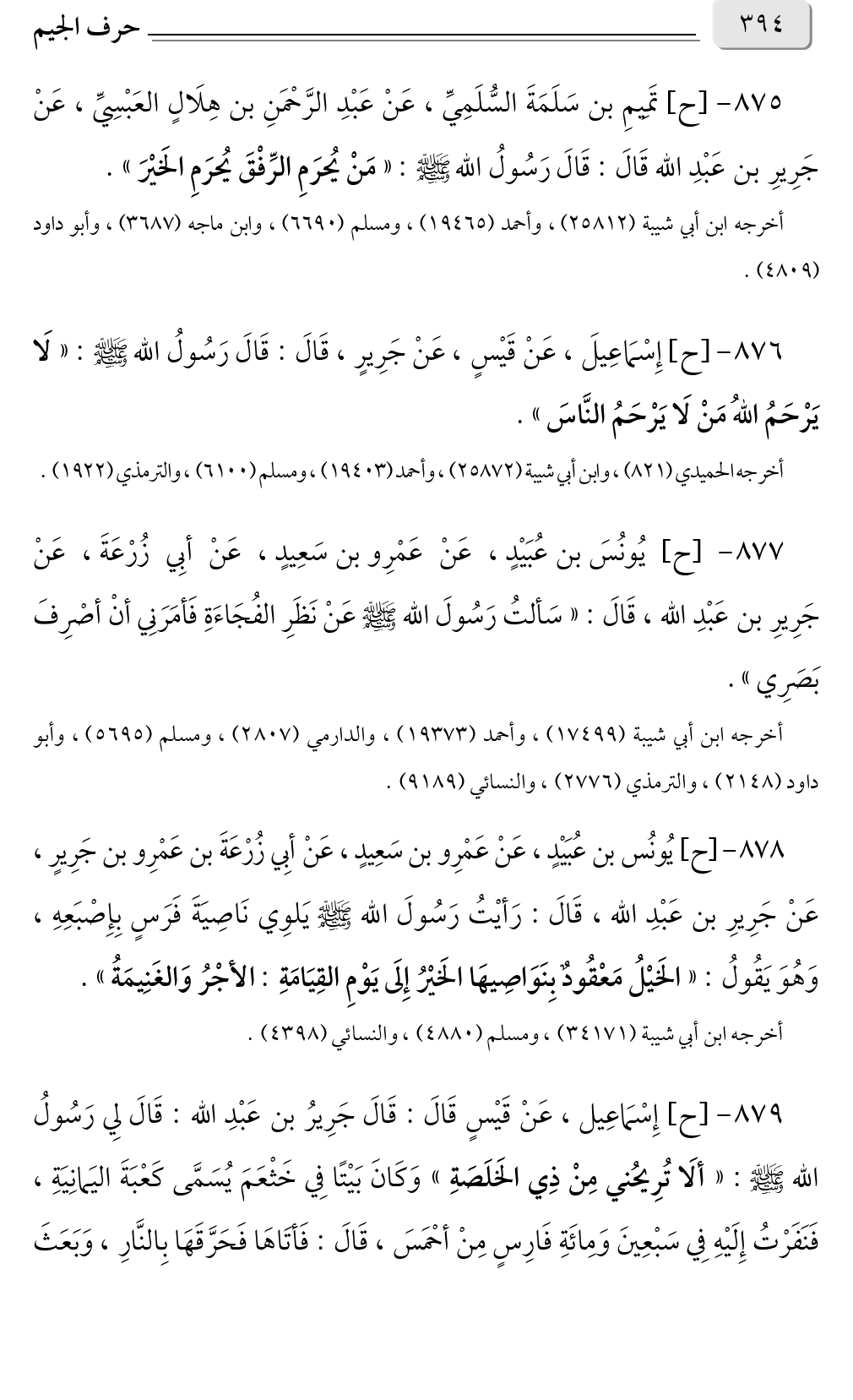 ٨٧٦ - [ح] إِسْمَاعِيلَ، عَنْ قَيْسٍ، عَنْ جَرِيرٍ، قَالَ: قَالَ رَسُولُ الله صلى الله عليه وسلم: «لَا يَرْحَمُ اللهُ مَنْ لَا يَرْحَمُ النَّاسَ».