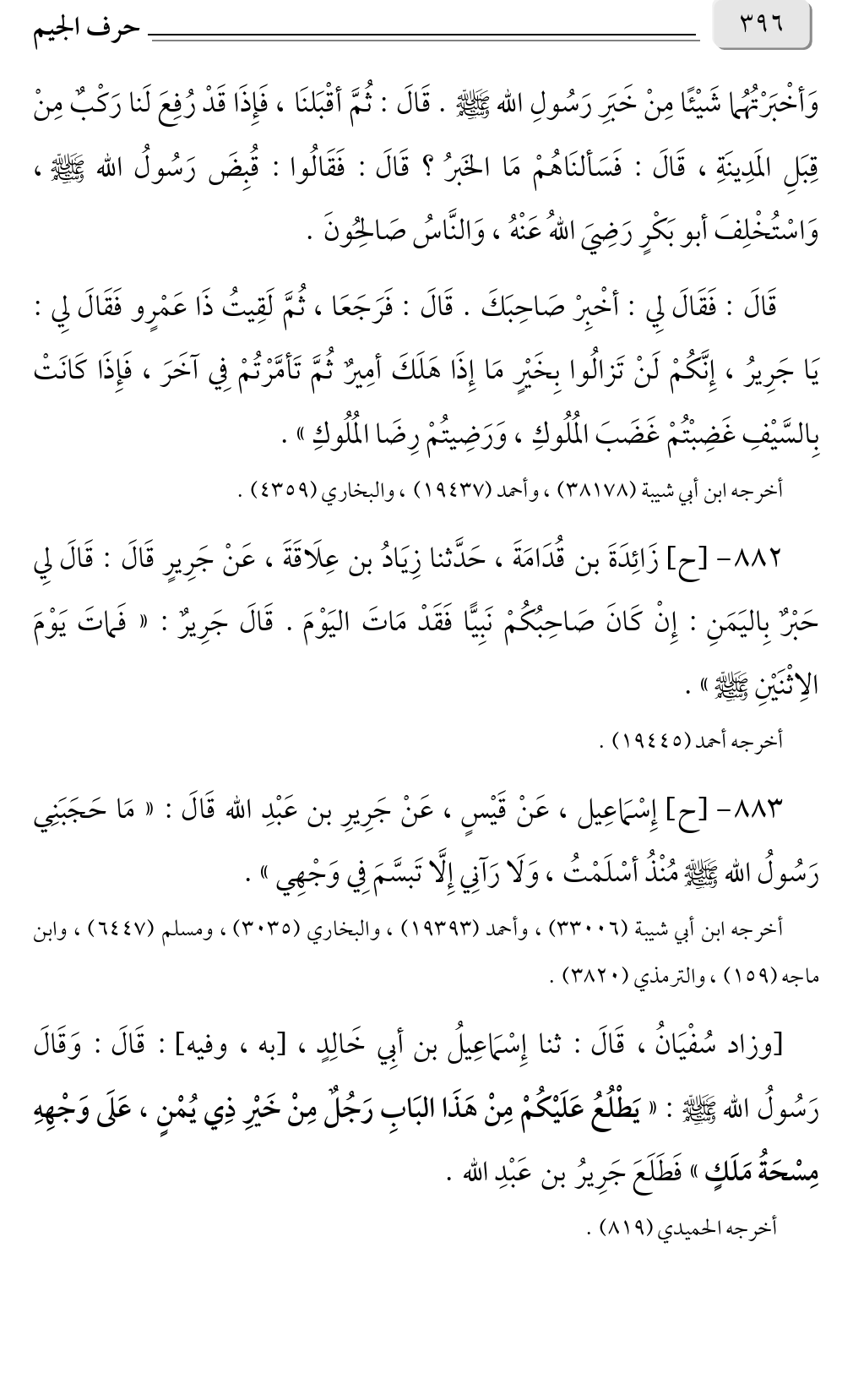 ٨٨٣ - [ح] إِسْمَاعِيل، عَنْ قَيْسٍ، عَنْ جَرِيرِ بن عَبْدِ الله قَالَ: «مَا حَجَبَنِي رَسُولُ الله صلى الله عليه وسلم مُنْذُ أسْلَمْتُ، وَلَا رَآنِي إِلَّا تَبسَّمَ فِي وَجْهِي».