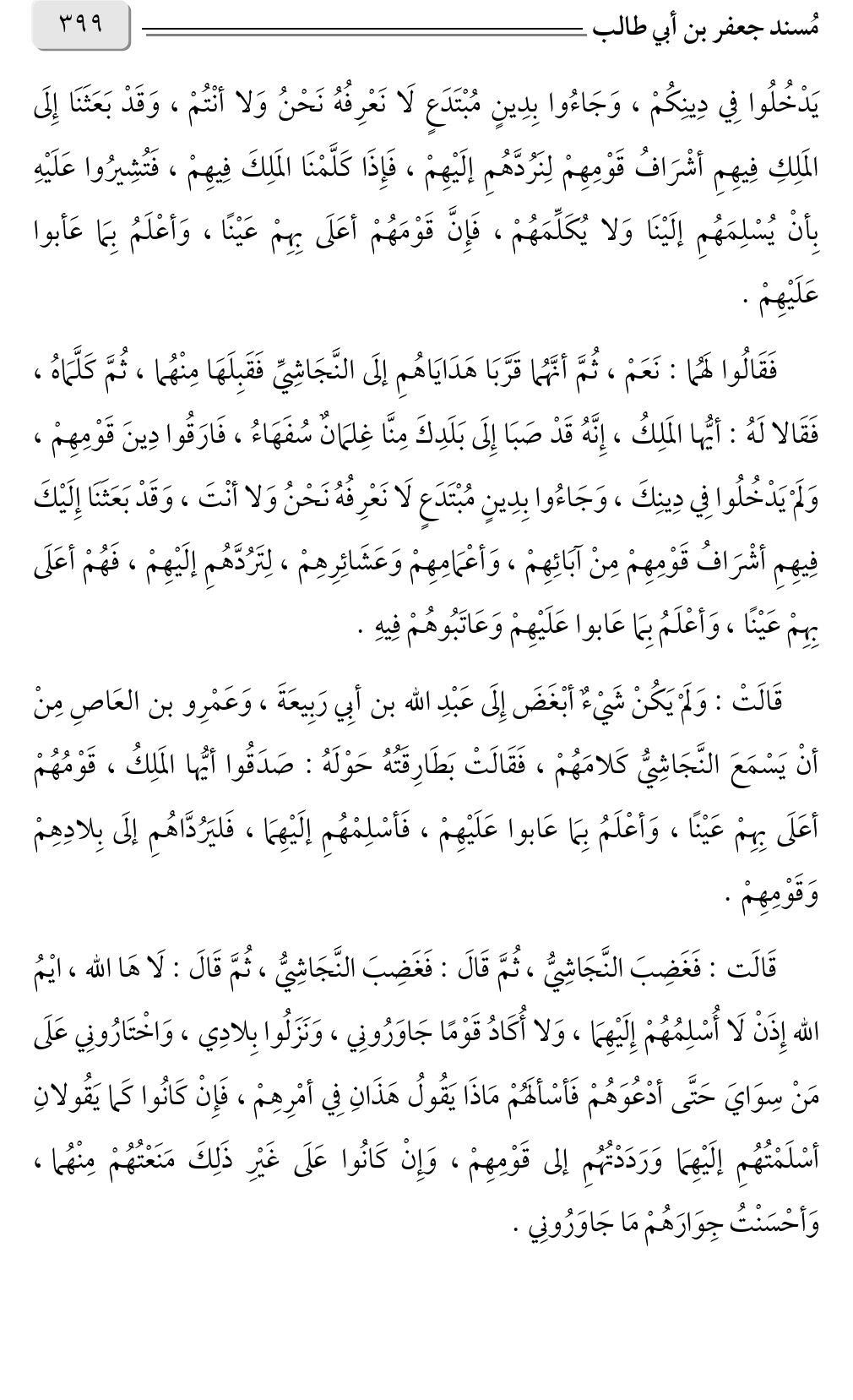 قَالَت: فَغَضِبَ النَّجَاشِيُّ، ثُمَّ قَالَ: فَغَضِبَ النَّجَاشِيُّ، ثُمَّ قَالَ: لَا هَا الله، ايْمُ الله إِذَنْ لَا أُسْلِمُهُمْ إِلَيْهِمَا، وَلا أُكَادُ قَوْمًا جَاوَرُونِي، وَنَزَلُوا بِلادِي، وَاخْتَارُونِي عَلَى مَنْ سِوَايَ حَتَّى أدْعُوَهُمْ فَأسْألَهُمْ مَاذَا يَقُولُ هَذَانِ فِي أمْرِهِمْ، فَإِنْ كَانُوا كَما يَقُولانِ أسْلَمْتُهُمِ إلَيْهِمَا وَرَدَدْتُهُمِ إلى قَوْمِهِمْ، وَإِنْ كَانُوا عَلَى غَيْرِ ذَلِكَ مَنَعْتُهُمْ مِنْهُما، وَأحْسَنْتُ جِوَارَهُمْ مَا جَاوَرُونِي.