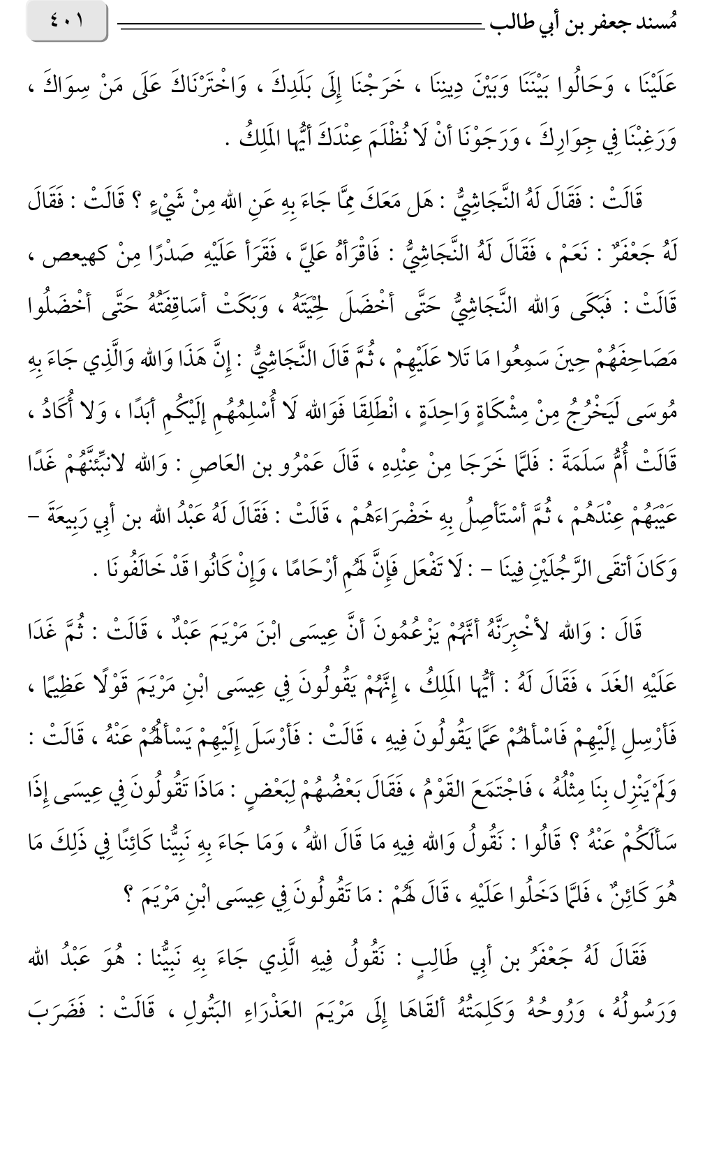 قَالَ: وَالله لأخْبِرَنَّهُ أنَّهُمْ يَزْعُمُونَ أنَّ عِيسَى ابْنَ مَرْيَمَ عَبْدٌ، قَالَتْ: ثُمَّ غَدَا عَلَيْهِ الغَدَ، فَقَالَ لَهُ: أيُّها المَلِكُ، إِنَّهُمْ يَقُولُونَ فِي عِيسَى ابْنِ مَرْيَمَ قَوْلًا عَظِيمًا، فَأرْسِلِ إلَيْهِمْ فَاسْألهُمْ عَمَّا يَقُولُونَ فِيهِ، قَالَتْ: فَأرْسَلَ إِلَيْهِمْ يَسْألُهُمْ عَنْهُ، قَالَتْ: وَلَمْ يَنْزِل بِنَا مِثْلُهُ، فَاجْتَمَعَ القَوْمُ، فَقَالَ بَعْضُهُمْ لِبَعْضٍ: مَاذَا تَقُولُونَ فِي عِيسَى إِذَا سَألَكُمْ عَنْهُ؟ قَالُوا: نَقُولُ وَالله فِيهِ مَا قَالَ اللهُ، وَمَا جَاءَ بِهِ نَبِيُّنا كَائِنًا فِي ذَلِكَ مَا هُوَ كَائِنٌ، فَلمَّا دَخَلُوا عَلَيْهِ، قَالَ لَهُمْ: مَا تَقُولُونَ فِي عِيسَى ابْنِ مَرْيَمَ؟ فَقَالَ لَهُ جَعْفَرُ بن أبِي طَالِبٍ: نَقُولُ فِيهِ الَّذِي جَاءَ بِهِ نَبِيُّنا: هُوَ عَبْدُ الله وَرَسُولُهُ، وَرُوحُهُ وَكَلِمَتُهُ ألقَاهَا إِلَى مَرْيَمَ العَذْرَاءِ البَتُولِ، قَالَتْ: فَضَرَبَ