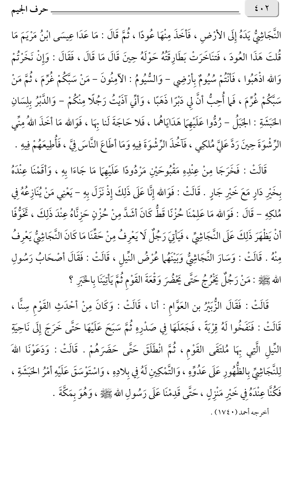 النَّجَاشِيُّ يَدَهُ إِلَى الأرْضِ، فَأخَذَ مِنْهَا عُودًا، ثُمَّ قَالَ: مَا عَدَا عِيسَى ابْنُ مَرْيَمَ مَا قُلتَ هَذَا العُودَ، فَتنَاخَرَتْ بَطَارِقَتُهُ حَوْلَهُ حِينَ قَالَ مَا قَالَ، فَقَالَ: وَإِنْ نَخَرْتُمْ وَالله اذْهَبُوا، فَأنْتُمْ سُيُومٌ بِأرْضِي - وَالسُّيُومُ: الآمِنُونَ - مَنْ سَبَّكُمْ غُرِّمَ، ثُمَّ مَنْ سَبَّكُمْ غُرِّمَ، فَما أُحِبُّ أنَّ لِي دَبْرًا ذَهَبًا، وَأنِّي آذَيْتُ رَجُلًا مِنْكُمْ - وَالدَّبْرُ بِلِسَانِ الحَبَشَةِ: الجَبَلُ - رُدُّوا عَلَيْهِمَا هَدَايَاهُما، فَلا حَاجَةَ لَنا بِهَا، فَوَالله مَا أخَذَ اللهُ مِنِّي الرِّشْوَةَ حِينَ رَدَّ عَليَّ مُلكِي، فَآخُذَ الرِّشْوَةَ فِيهِ وَمَا أطَاعَ النَّاسَ فِيَّ، فَأُطِيعَهُمْ فِيهِ.
