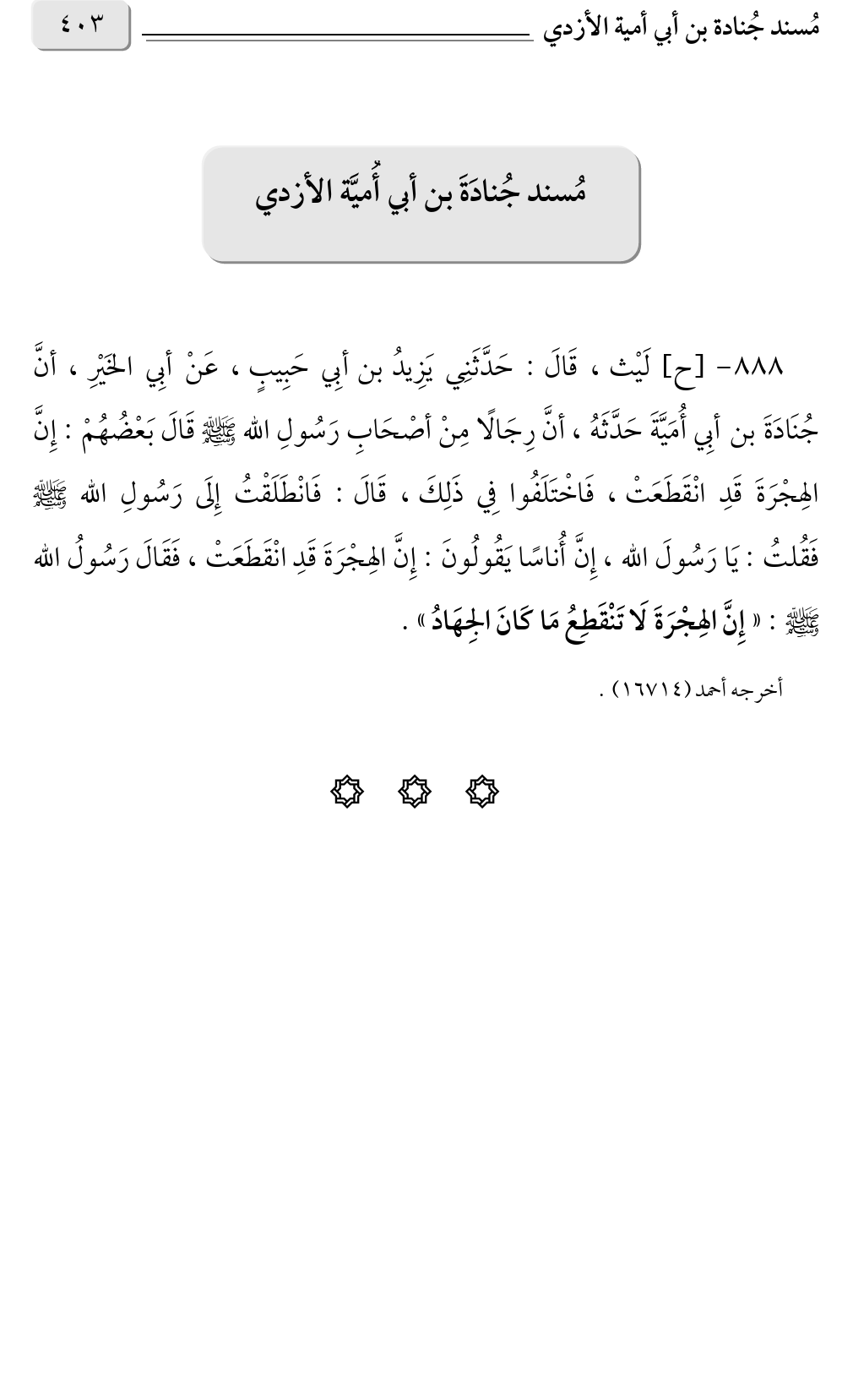 ٨٨٨ - [ح] لَيْث، قَالَ: حَدَّثَنِي يَزِيدُ بن أبِي حَبِيبٍ، عَنْ أبِي الخَيْرِ، أنَّ جُنَادَةَ بن أبِي أُمَيَّةَ حَدَّثَهُ، أنَّ رِجَالًا مِنْ أصْحَابِ رَسُولِ الله صلى الله عليه وسلم قَالَ بَعْضُهُمْ: إِنَّ الهِجْرَةَ قَدِ انْقَطَعَتْ، فَاخْتَلَفُوا فِي ذَلِكَ، قَالَ: فَانْطَلَقْتُ إِلَى رَسُولِ الله صلى الله عليه وسلم فَقُلتُ: يَا رَسُولَ الله، إِنَّ أُناسًا يَقُولُونَ: إِنَّ الهِجْرَةَ قَدِ انْقَطَعَتْ، فَقَالَ رَسُولُ الله صلى الله عليه وسلم: «إِنَّ الهِجْرَةَ لَا تَنْقَطِعُ مَا كَانَ الجِهَادُ».