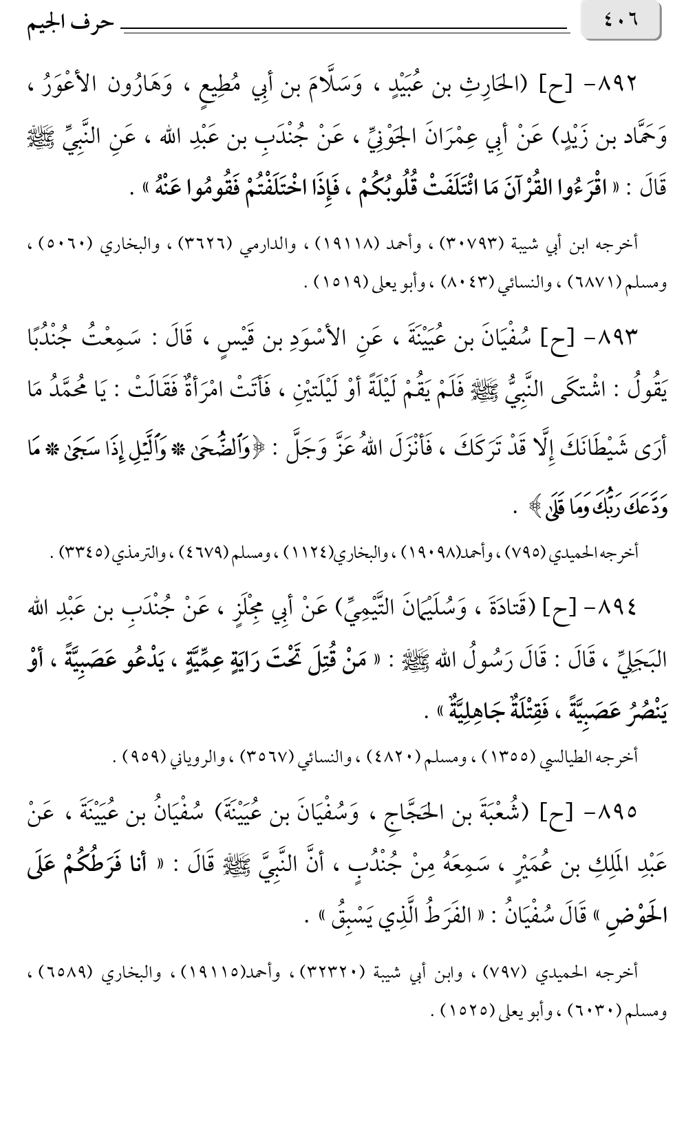 ٨٩٢ - [ح] (الحَارِثِ بن عُبَيْدٍ، وَسَلَّامَ بن أبِي مُطِيعٍ، وَهَارُون الأعْوَرُ، وَحَمَّاد بن زَيْدٍ) عَنْ أبِي عِمْرَانَ الجَوْنِيِّ، عَنْ جُنْدَبِ بن عَبْدِ الله، عَنِ النَّبِيِّ صلى الله عليه وسلم قَالَ: «اقْرَءُوا القُرْآنَ مَا ائْتَلَفَتْ قُلُوبُكُمْ، فَإِذَا اخْتَلَفْتُمْ فَقُومُوا عَنْهُ».
