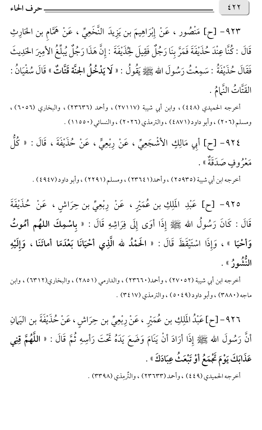 ٩٢٥ - [ح] عَبْدِ المَلِكِ بن عُمَيْرٍ، عَنْ رِبْعِيِّ بن حِرَاشٍ، عَنْ حُذَيْفَةَ قَالَ: كَانَ رَسُولُ الله صلى الله عليه وسلم إِذَا أوَى إِلَى فِرَاشِهِ قَالَ: «بِاسْمِكَ اللهُم أمُوتُ وَأحْيَا» وَإِذَا اسْتَيْقَظَ قَالَ، : «الحَمْدُ لله الَّذِي أحْيَانَا بَعْدَمَا أماتَنَا، وَإِلَيْهِ النُّشُورُ».