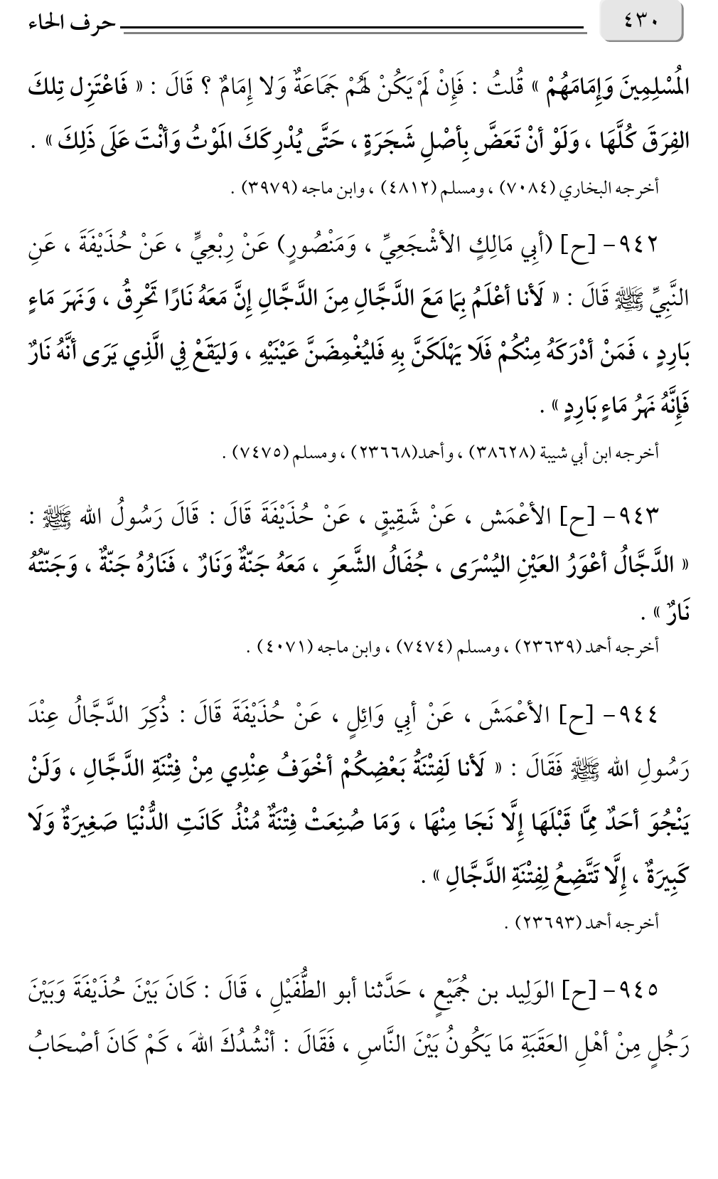 ٩٤٣ - [ح] الأعْمَش، عَنْ شَقِيقٍ، عَنْ حُذَيْفَةَ قَالَ: قَالَ رَسُولُ الله صلى الله عليه وسلم: «الدَّجَّالُ أعْوَرُ العَيْنِ اليُسْرَى، جُفَالُ الشَّعَرِ، مَعَهُ جَنّةٌ وَنَارٌ، فَنَارُهُ جَنّةٌ، وَجَنّتُهُ نَارٌ».