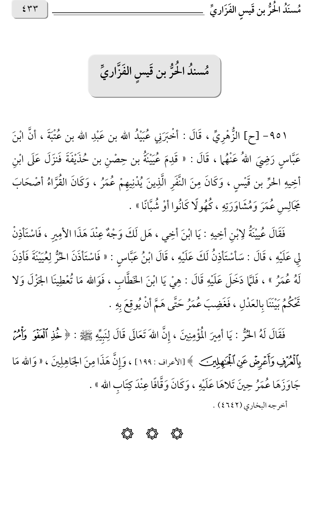 فَقَالَ لَهُ الحُرُّ: يَا أمِيرَ المُؤْمِنِينَ، إِنَّ اللهَ تَعَالَى قَالَ لِنَبِيِّهِ صلى الله عليه وسلم {خُذِ الْعَفْوَ وَأْمُرْ بِالْعُرْفِ وَأَعْرِضْ عَنِ الْجَاهِلِينَ} [الأعراف: ١٩٩]، وَإِنَّ هَذَا مِنَ الجَاهِلِينَ، «وَالله مَا جَاوَزَهَا عُمَرُ حِينَ تَلاهَا عَلَيْهِ، وَكَانَ وَقَّافًا عِنْدَ كِتَابِ الله».