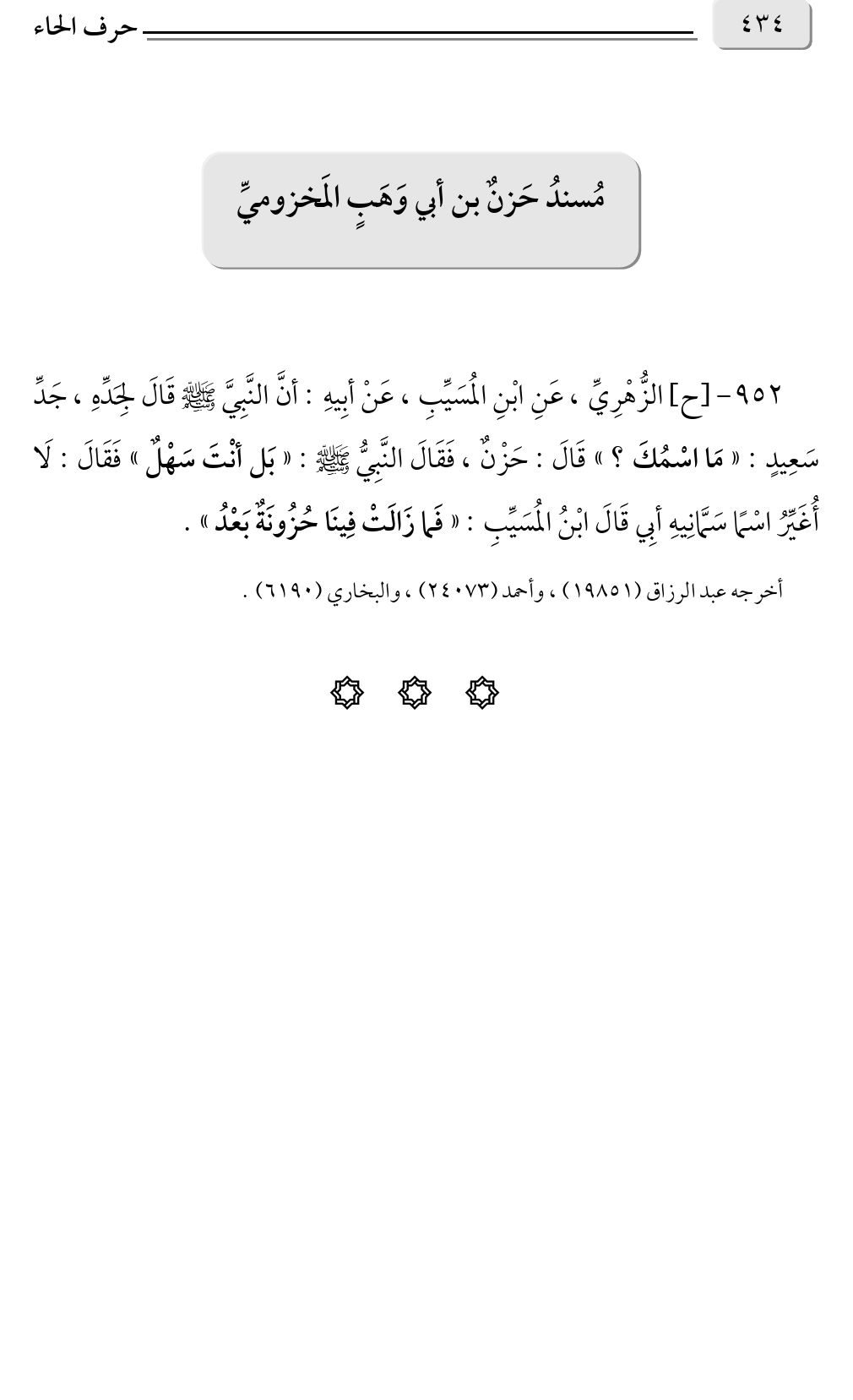 ٩٥٢ - [ح] الزُّهْرِيِّ، عَنِ ابْنِ المُسَيِّبِ، عَنْ أبِيهِ: أنَّ النَّبِيَّ صلى الله عليه وسلم قَالَ لجَدِّهِ، جَدِّ سَعِيدٍ: «مَا اسْمُكَ؟ » قَالَ: حَزْنٌ، فَقَالَ النَّبِيُّ صلى الله عليه وسلم: «بَل أنْتَ سَهْلٌ» فَقَالَ: لَا أُغَيِّرُ اسْمًا سَمَّانِيهِ أبِي قَالَ ابْنُ المُسَيِّبِ: «فَما زَالَتْ فِينَا حُزُونَةٌ بَعْدُ».