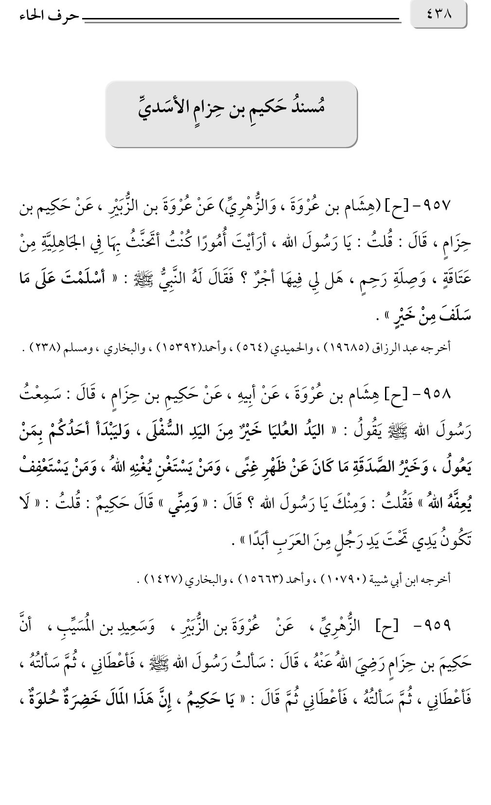 ٩٥٧ - [ح] (هِشَام بن عُرْوَةَ، وَالزُّهْرِيِّ) عَنْ عُرْوَةَ بن الزُّبَيْرِ، عَنْ حَكِيم بن حِزَامٍ، قَالَ: قُلتُ: يَا رَسُولَ الله، أرَأيْتَ أُمُورًا كُنْتُ أتَحنَّثُ بِهَا فِي الجَاهِلِيَّةِ مِنْ عَتَاقَةٍ، وَصِلَةِ رَحِمٍ، هَل لِي فِيهَا أجْرٌ؟ فَقَالَ لَهُ النَّبِيُّ صلى الله عليه وسلم: «أسْلَمْتَ عَلَى مَا سَلَفَ مِنْ خَيْرٍ».