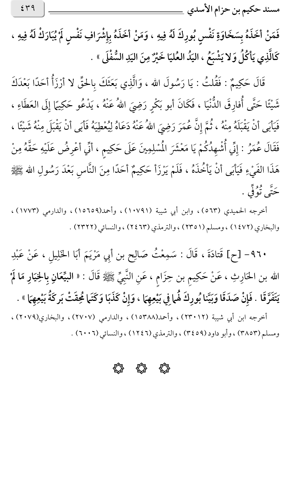 قَالَ حَكِيمٌ: فَقُلتُ: يَا رَسُولَ الله، وَالَّذِي بَعَثَكَ بِالحقِّ لا أرْزَأُ أحَدًا بَعْدَكَ شَيْئًا حَتَّى أُفارِقَ الدُّنْيَا، فَكَانَ أبو بَكْرٍ رَضِيَ اللهُ عَنْهُ، يَدْعُو حَكِيمًا إِلَى العَطَاءِ، فَيَأبَى أنْ يَقْبَلَهُ مِنْهُ، ثُمَّ إِنَّ عُمَرَ رَضِيَ اللهُ عَنْهُ دَعَاهُ لِيُعْطِيَهُ فَأبَى أنْ يَقْبَلَ مِنْهُ شَيْئًا، فَقَالَ عُمَرُ: إِنِّي أُشْهِدُكُمْ يَا مَعْشَرَ المُسْلِمِينَ عَلَى حَكِيمٍ، أنِّي أعْرِضُ عَلَيْهِ حَقَّهُ مِنْ هَذَا الفَيْءِ فَيَأبَى أنْ يَأخُذَهُ، فَلَمْ يَرْزَأ حَكِيمٌ أحَدًا مِنَ النَّاسِ بَعْدَ رَسُولِ الله صلى الله عليه وسلم حَتَّى تُوُفِّي.