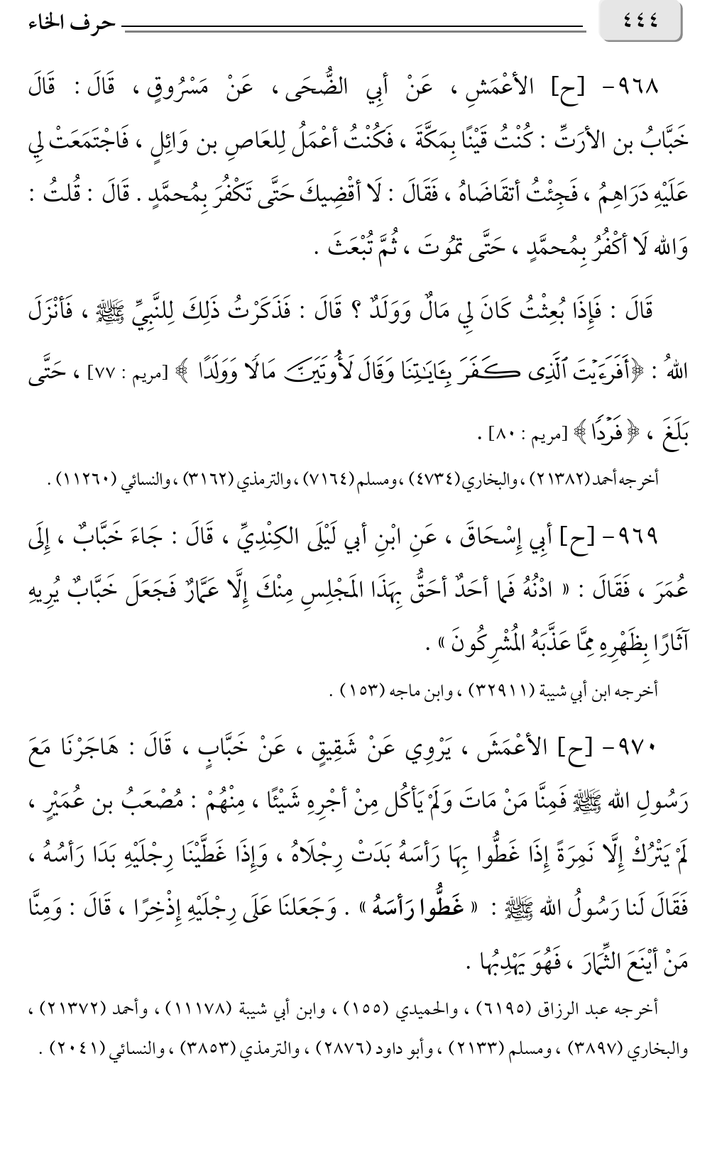 ٩٦٨ - [ح] الأعْمَشِ، عَنْ أبِي الضُّحَى، عَنْ مَسْرُوقٍ، قَالَ: قَالَ خَبَّابُ بن الأرَتِّ: كُنْتُ قَيْنًا بِمَكَّةَ، فَكُنْتُ أعْمَلُ لِلعَاصِ بن وَائِلٍ، فَاجْتَمَعَتْ لِي عَلَيْهِ دَرَاهِمُ، فَجِئْتُ أتقَاضَاهُ، فَقَالَ: لَا أقْضِيكَ حَتَّى تَكْفُرَ بِمُحمَّدٍ. قَالَ: قُلتُ: وَالله لَا أكْفُرُ بِمُحمَّدٍ، حَتَّى تمُوتَ، ثُمَّ تُبْعَثَ.