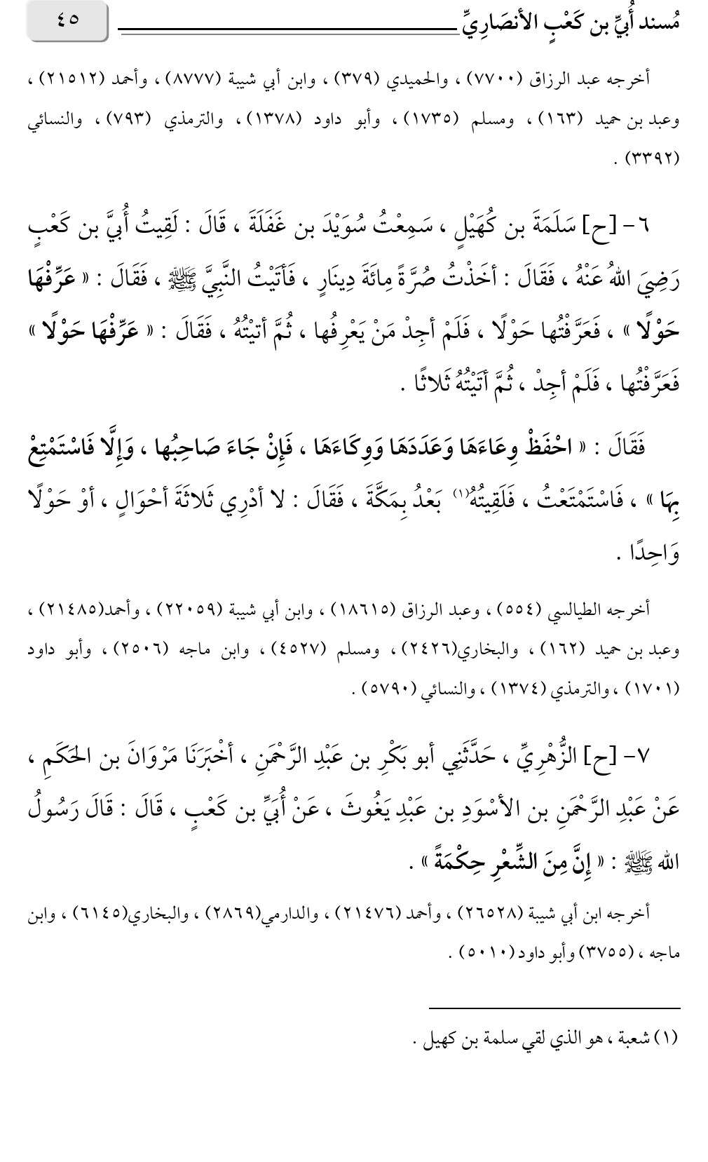 ٦ - [ح] سَلَمَةَ بن كُهَيْلٍ، سَمِعْتُ سُوَيْدَ بن غَفَلَةَ، قَالَ: لَقِيتُ أُبيَّ بن كَعْبٍ رَضِيَ اللهُ عَنْهُ، فَقَالَ: أخَذْتُ صُرَّةً مِائَةَ دِينَارٍ، فَأتَيْتُ النَّبِيَّ صلى الله عليه وسلم، فَقَالَ: "عَرِّفْهَا حَوْلًا»: فَعَرَّفْتُها حَوْلًا، فَلَمْ أجِدْ مَنْ يَعْرِفُها، ثُمَّ أتيْتُهُ، فَقَالَ: «عَرِّفْهَا حَوْلًا" فَعَرَّفْتُها، فَلَمْ أجِدْ، ثُمَّ أتَيْتُهُ ثَلاثًا.