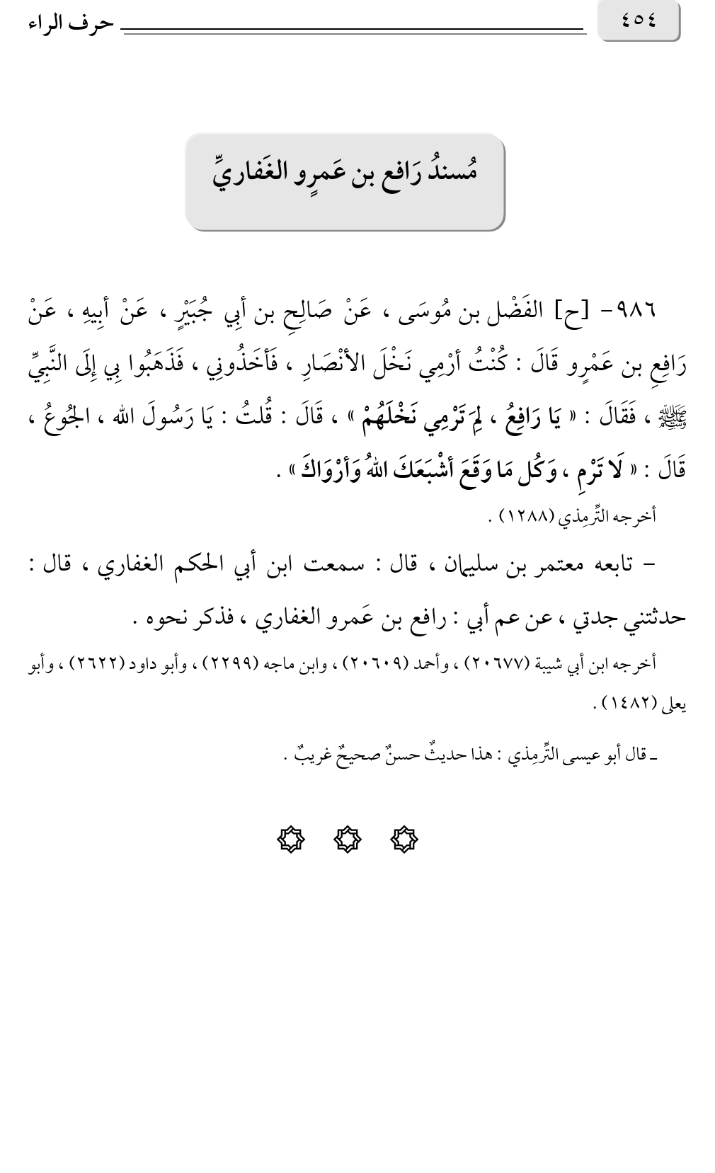 ٩٨٦ - [ح] الفَضْل بن مُوسَى، عَنْ صَالِحِ بن أبِي جُبَيْرٍ، عَنْ أبِيهِ، عَنْ رَافِعِ بن عَمْرٍو قَالَ: كُنْتُ أرْمِي نَخْلَ الأنْصَارِ، فَأخَذُونِي، فَذَهَبُوا بِي إِلَى النَّبِيِّ صلى الله عليه وسلم، فَقَالَ: «يَا رَافِعُ، لِمَ تَرْمِي نَخْلَهُمْ» قَالَ: قُلتُ: يَا رَسُولَ الله، الجُوعُ، ، قَالَ: «لَا تَرْمِ، وَكُل مَا وَقَعَ أشْبَعَكَ اللهُ وَأرْوَاكَ».