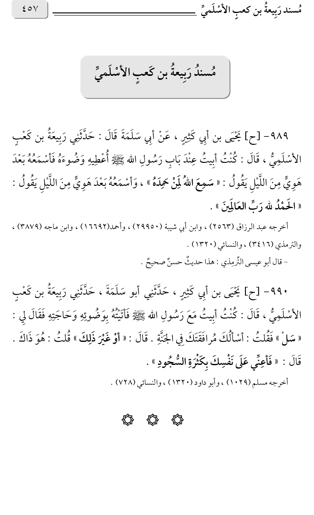 ٩٩٠ - [ح] يَحْيَى بن أبِي كَثِيرٍ، حَدَّثَنِي أبو سَلَمَةَ، حَدَّثَنِي رَبِيعَةُ بن كَعْبٍ الأسْلَمِيُّ، قَالَ: كُنْتُ أبِيتُ مَعَ رَسُولِ الله صلى الله عليه وسلم فَأتَيْتُهُ بِوَضُوئِهِ وَحَاجَتِهِ فَقَالَ لِي: «سَلْ» فَقُلتُ: أسْألُكَ مُرافَقَتَكَ فِي الجَنَّةِ. قَالَ: «أوْ غَيْرَ ذَلِكَ؟ » قُلتُ: هُوَ ذَاكَ. قَالَ: «فَأعِنِّي عَلَى نَفْسِكَ بِكَثْرَةِ السُّجُودِ».