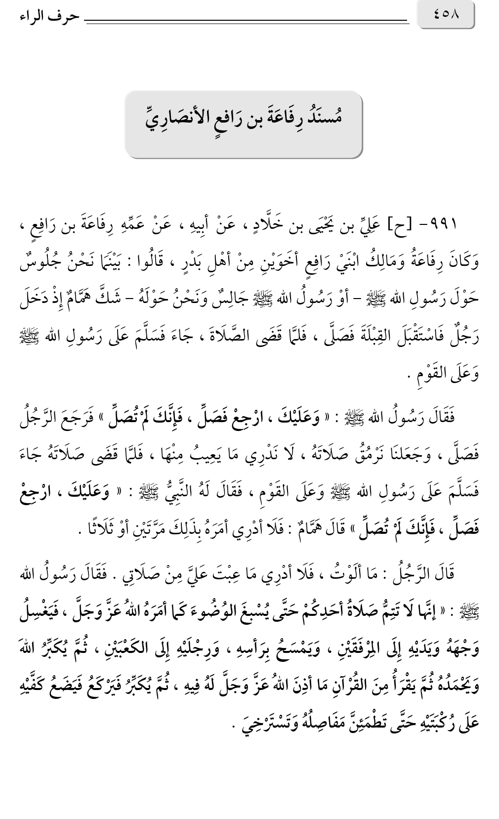 ٩٩١ - [ح] عَلِيِّ بن يَحْيَى بن خَلَّادٍ، عَنْ أبِيهِ، عَنْ عَمِّهِ رِفَاعَةَ بن رَافِعٍ، وَكَانَ رِفَاعَةُ وَمَالِكُ ابْنَيْ رَافِعٍ أخَوَيْنِ مِنْ أهْلِ بَدْرٍ، قَالُوا: بَيْنَمَا نَحْنُ جُلُوسٌ حَوْلَ رَسُولِ الله صلى الله عليه وسلم - أوْ رَسُولُ الله صلى الله عليه وسلم جَالِسٌ وَنَحْنُ حَوْلَهُ - شَكَّ هَمَّامٌ إِذْ دَخَلَ رَجُلٌ فَاسْتَقْبَلَ القِبْلَةَ فَصَلَّى، فَلمَّا قَضَى الصَّلَاةَ، جَاءَ فَسَلَّمَ عَلَى رَسُولِ الله صلى الله عليه وسلم وَعَلَى القَوْمِ.