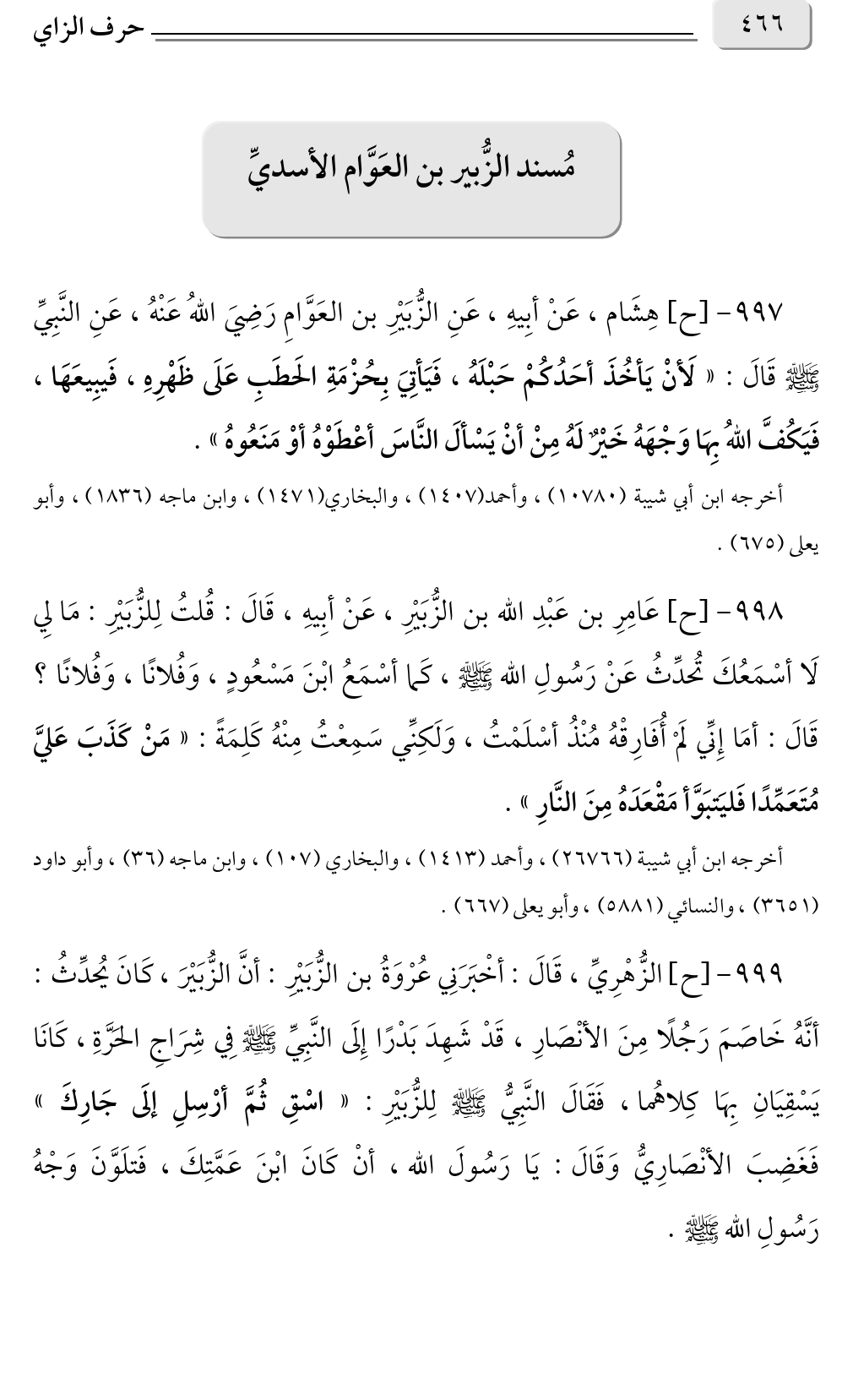 ٩٩٨ - [ح] عَامِرِ بن عَبْدِ الله بن الزُّبَيْرِ، عَنْ أبِيهِ، قَالَ: قُلتُ لِلزُّبَيْرِ: مَا لِي لَا أسْمَعُكَ تُحدِّثُ عَنْ رَسُولِ الله صلى الله عليه وسلم، كَما أسْمَعُ ابْنَ مَسْعُودٍ، وَفُلانًا، وَفُلانًا؟ قَالَ: أمَا إِنِّي لَمْ أُفَارِقْهُ مُنْذُ أسْلَمْتُ، وَلَكِنِّي سَمِعْتُ مِنْهُ كَلِمَةً: «مَنْ كَذَبَ عَليَّ مُتَعَمِّدًا فَليَتبَوَّأ مَقْعَدَهُ مِنَ النَّارِ».