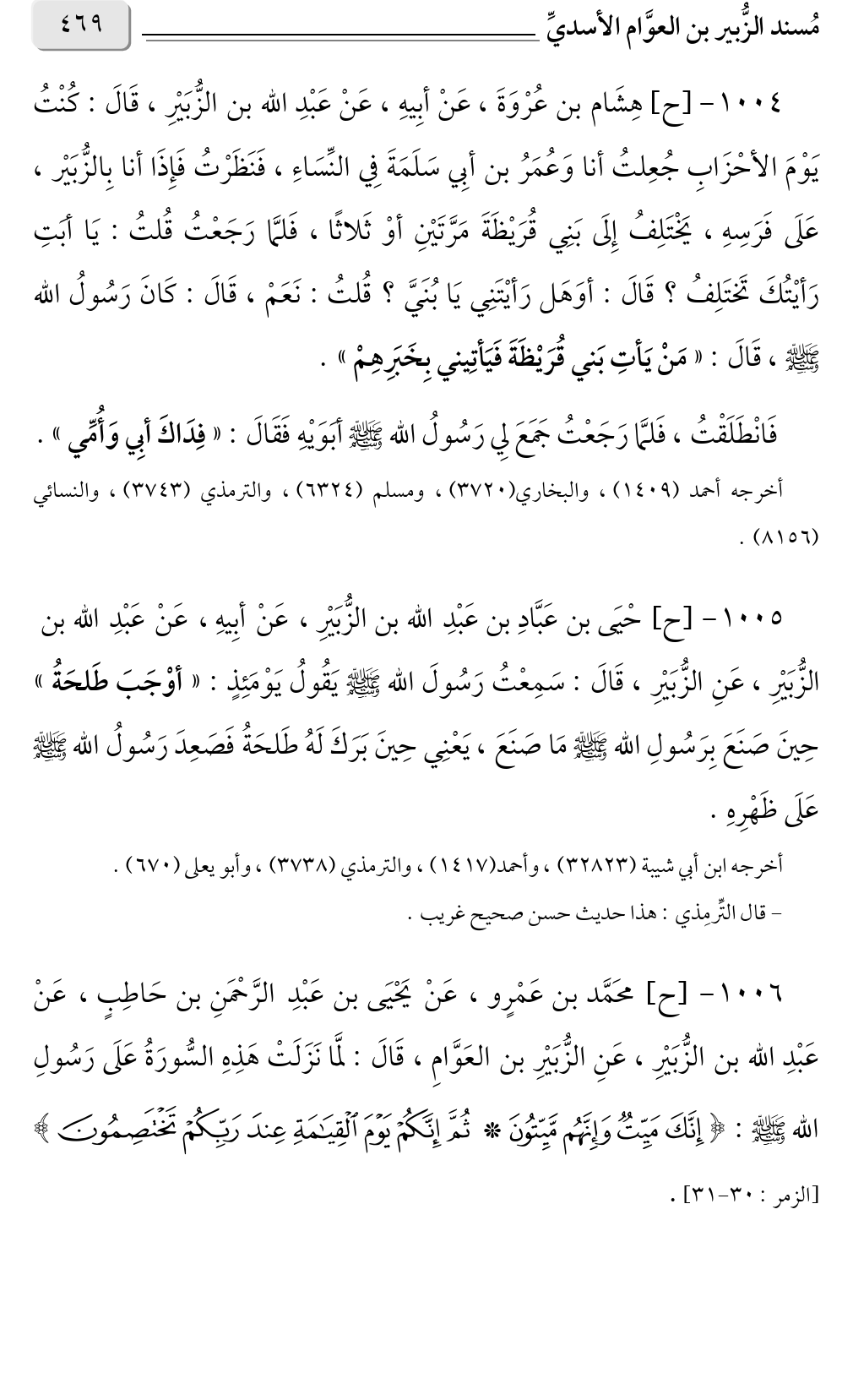 ١٠٠٥ - [ح] حْيَى بن عَبَّادِ بن عَبْدِ الله بن الزُّبَيْرِ، عَنْ أبِيهِ، عَنْ عَبْدِ الله بن الزُّبَيْرِ، عَنِ الزُّبَيْرِ، قَالَ: سَمِعْتُ رَسُولَ الله صلى الله عليه وسلم يَقُولُ يَوْمَئِذٍ: «أوْجَبَ طَلحَةُ» حِينَ صَنَعَ بِرَسُولِ الله صلى الله عليه وسلم مَا صَنَعَ، يَعْنِي حِينَ بَرَكَ لَهُ طَلحَةُ فَصَعِدَ رَسُولُ الله صلى الله عليه وسلم عَلَى ظَهْرِهِ.