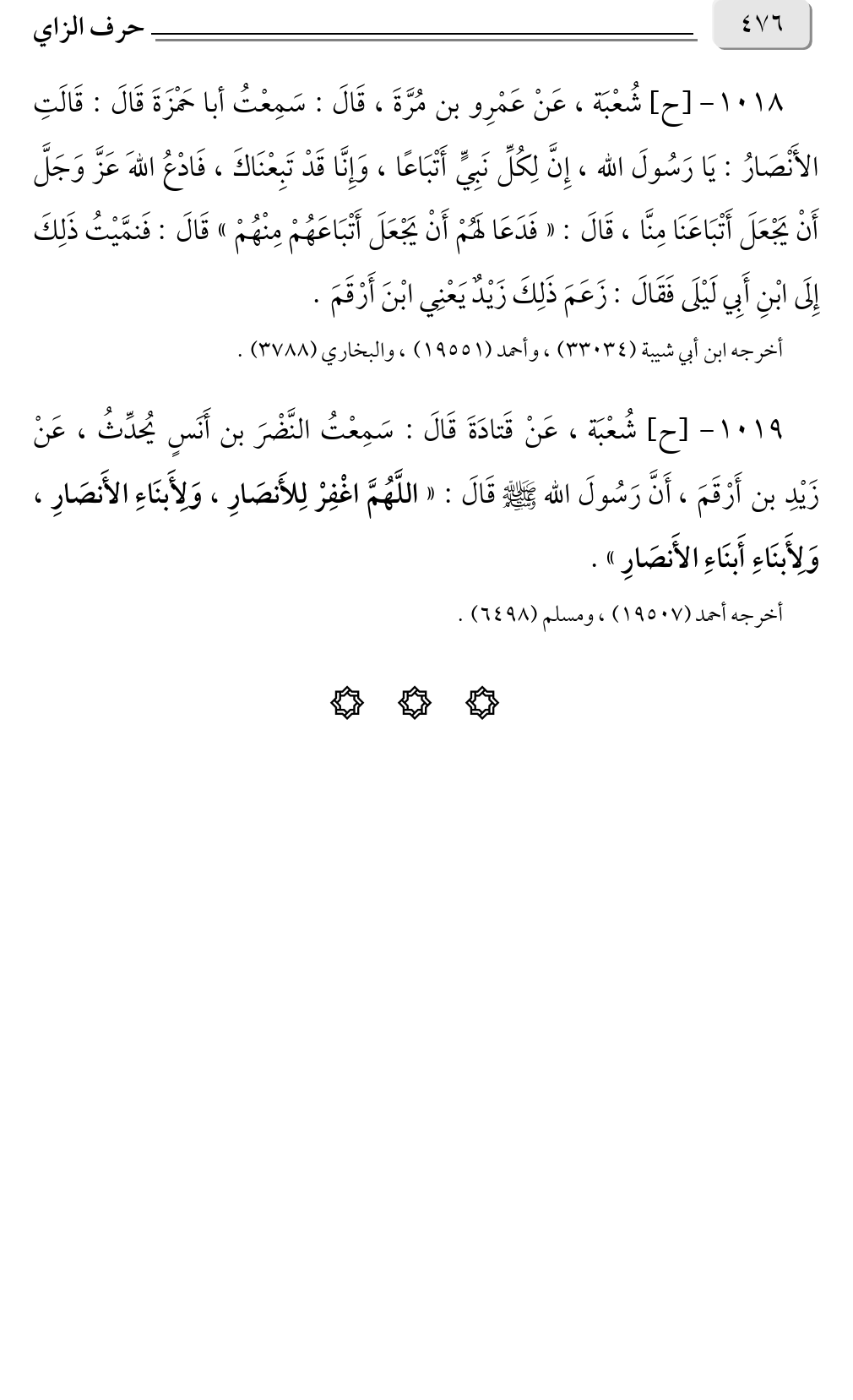 ١٠١٩ - [ح] شُعْبَة، عَنْ قَتادَةَ قَالَ: سَمِعْتُ النَّضْرَ بن أَنَسٍ يُحدِّثُ، عَنْ زَيْدِ بن أَرْقَمَ، أَنَّ رَسُولَ الله صلى الله عليه وسلم قَالَ: «اللَّهُمَّ اغْفِرْ لِلأَنصَارِ، وَلِأَبنَاءِ الأَنصَارِ، وَلِأَبنَاءِ أَبنَاءِ الأَنصَارِ».