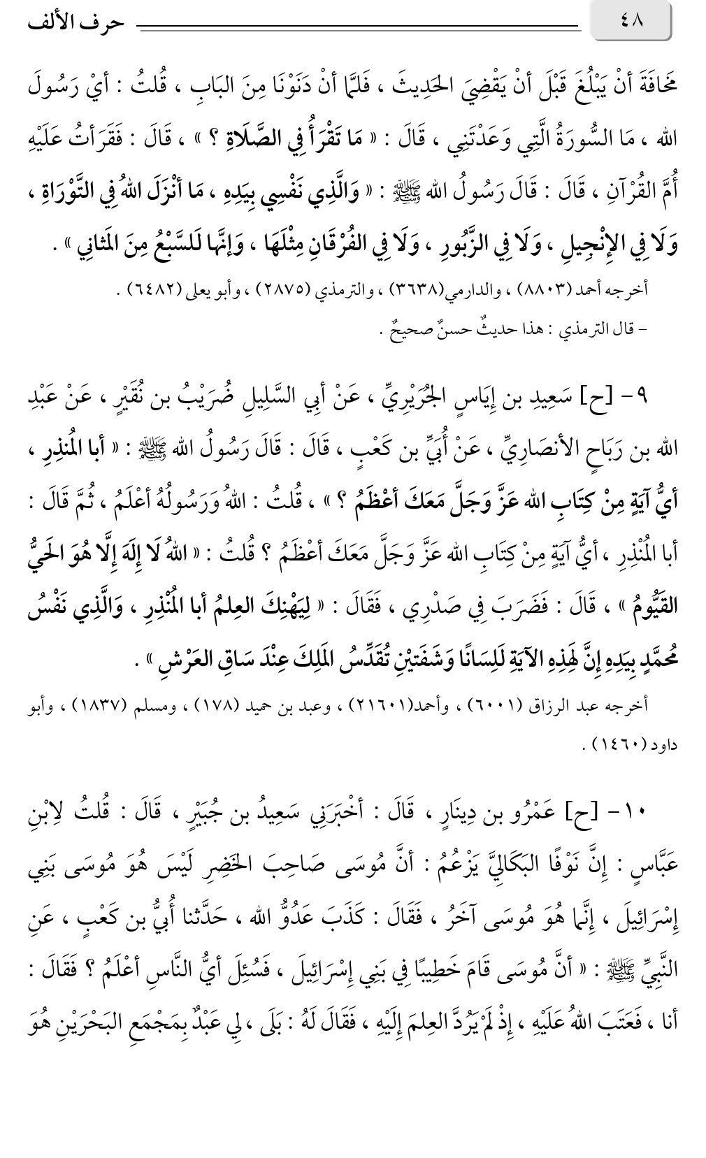 ٩ - [ح] سَعِيدِ بن إِيَاسٍ الجُرَيْرِيِّ، عَنْ أبِي السَّلِيلِ ضُرَيْبُ بن نُقَيْرٍ، عَنْ عَبْدِ الله بن رَبَاحٍ الأنصَارِيِّ، عَنْ أُبَيِّ بن كَعْبٍ، قَالَ: قَالَ رَسُولُ الله صلى الله عليه وسلم: «أبا المُنذِرِ، أيُّ آيَةٍ مِنْ كِتَابِ الله عَزَّ وَجَلَّ مَعَكَ أعْظَمُ؟ »، قُلتُ: اللهُ وَرَسُولُهُ أعْلَمُ، ثُمَّ قَالَ: أبا المُنْذِرِ، أيُّ آيَةٍ مِنْ كِتَابِ الله عَزَّ وَجَلَّ مَعَكَ أعْظَمُ؟ قُلتُ: «اللهُ لَا إِلَهَ إِلَّا هُوَ الحَيُّ القَيُّومُ»، قَالَ: فَضَرَبَ فِي صَدْرِي، فَقَالَ: «لِيَهْنِكَ العِلمُ أبا المُنْذِرِ، وَالَّذِي نَفْسُ مُحمَّدٍ بِيَدِهِ إِنَّ لَهِذِهِ الآيَةِ لَلِسَانًا وَشَفَتيْنِ تُقَدِّسُ المَلِكَ عِنْدَ سَاقِ العَرْشِ».