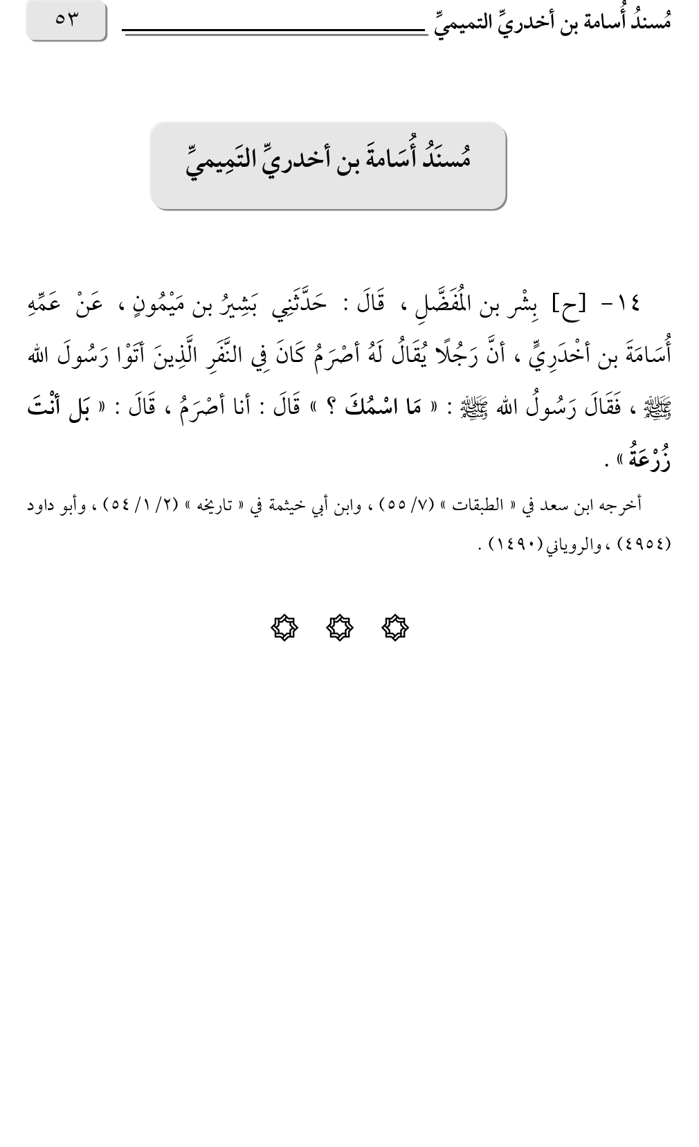 ١٤ - [ح] بِشْر بن المُفَضَّلِ، قَالَ: حَدَّثَنِي بَشِيرُ بن مَيْمُونٍ، عَنْ عَمِّهِ أُسَامَةَ بن أخْدَرِيٍّ، أنَّ رَجُلًا يُقَالُ لَهُ أصْرَمُ كَانَ فِي النَّفَرِ الَّذِينَ أتَوْا رَسُولَ الله صلى الله عليه وسلم، فَقَالَ رَسُولُ الله صلى الله عليه وسلم: «مَا اسْمُكَ؟ » قَالَ: أنا أصْرَمُ، قَالَ: «بَل أنْتَ زُرْعَةُ».