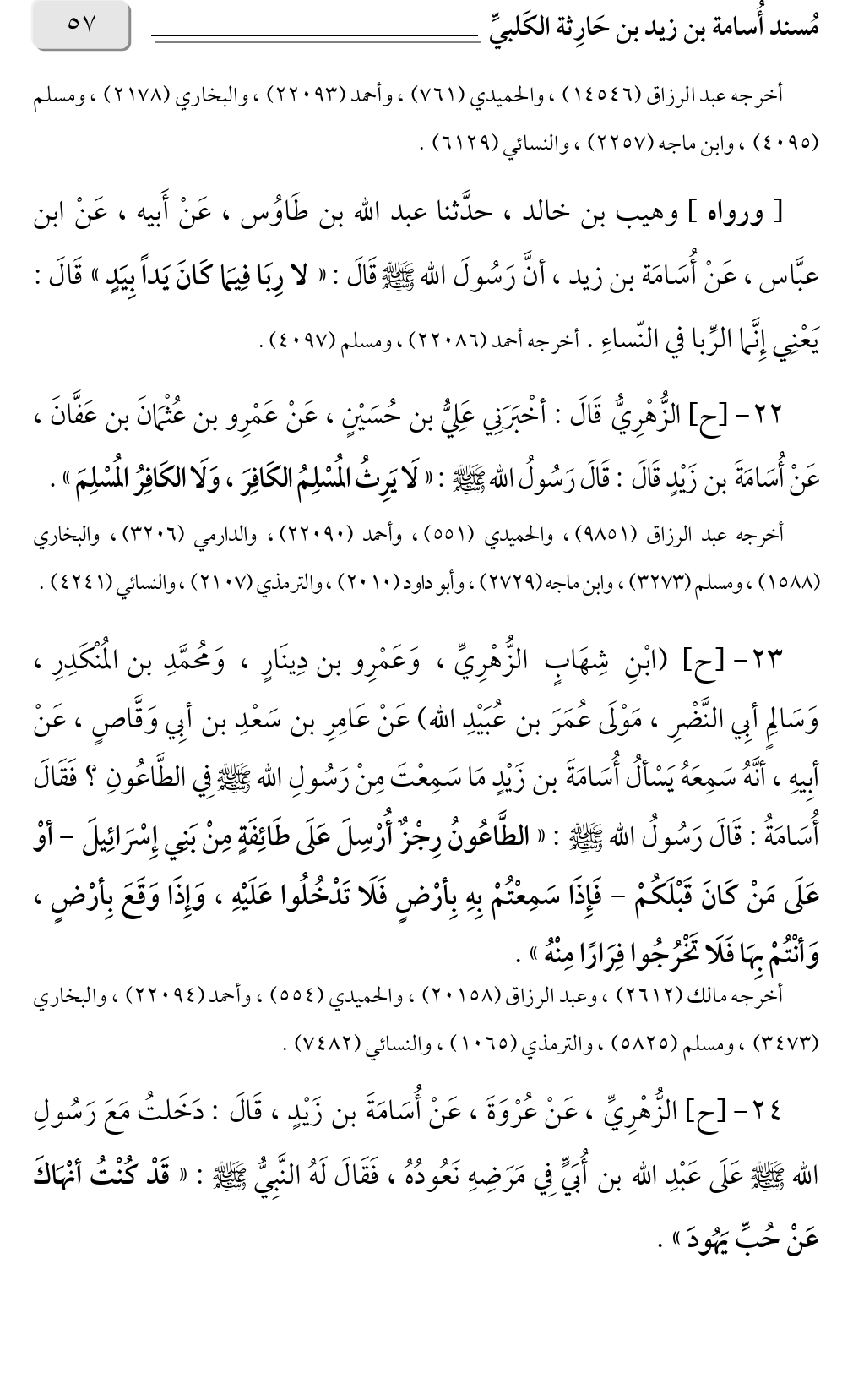٢٤ - [ح] الزُّهْرِيِّ، عَنْ عُرْوَةَ، عَنْ أُسَامَةَ بن زَيْدٍ، قَالَ: دَخَلتُ مَعَ رَسُولِ الله صلى الله عليه وسلم عَلَى عَبْدِ الله بن أُبَيٍّ فِي مَرَضِهِ نَعُودُهُ، فَقَالَ لَهُ النَّبِيُّ صلى الله عليه وسلم: «قَدْ كُنْتُ أنْهَاكَ عَنْ حُبِّ يَهُودَ».