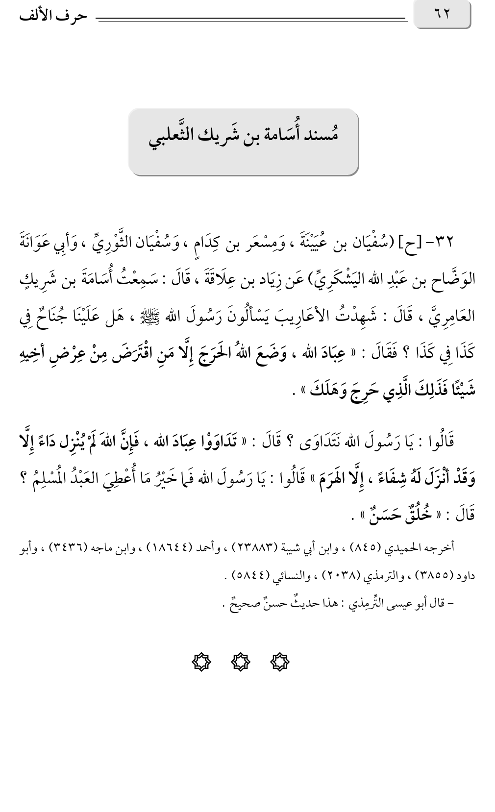 ٣٢ - [ح] (سُفْيَان بن عُيَيْنَةَ، وَمِسْعَر بن كِدَامٍ، وَسُفْيَان الثَّوْرِيِّ، وَأبِي عَوَانَةَ الوَضَّاح بن عَبْدِ الله اليَشْكَرِيِّ) عَن زِيَاد بن عِلَاقَةَ، قَالَ: سَمِعْتُ أُسَامَةَ بن شَرِيكٍ العَامِرِيَّ، قَالَ: شَهِدْتُ الأعَارِيبَ يَسْألُونَ رَسُولَ الله صلى الله عليه وسلم، هَل عَلَيْنَا جُنَاحٌ فِي كَذَا فِي كَذَا؟ فَقَالَ: «عِبَادَ الله، وَضَعَ اللهُ الحَرَجَ إِلَّا مَنِ اقْتَرَضَ مِنْ عِرْضِ أخِيهِ شَيْئًا فَذَلِكَ الَّذِي حَرِجَ وَهَلَكَ».