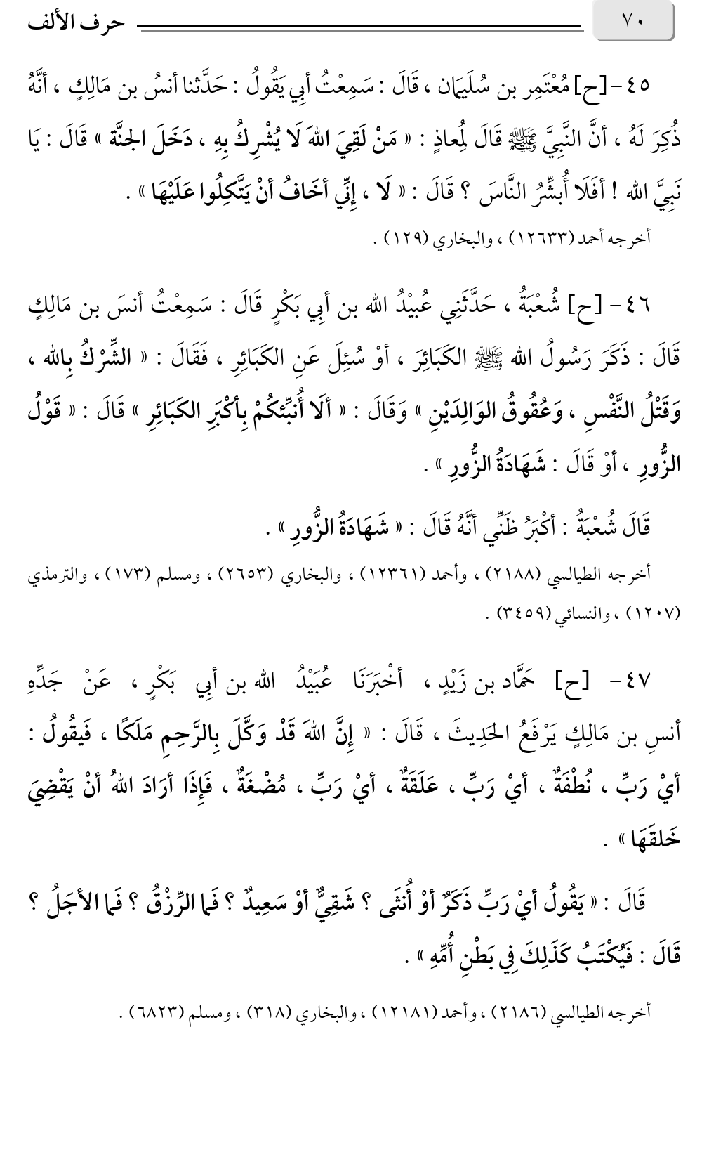٤٦ - [ح] شُعْبَةُ، حَدَّثَنِي عُبيْدُ الله بن أبِي بَكْرٍ قَالَ: سَمِعْتُ أنسَ بن مَالِكٍ قَالَ: ذَكَرَ رَسُولُ الله صلى الله عليه وسلم الكَبَائِرَ، أوْ سُئِلَ عَنِ الكَبَائِرِ، فَقَالَ: «الشِّرْكُ بِالله، وَقَتْلُ النَّفْسِ، وَعُقُوقُ الوَالِدَيْنِ" وَقَالَ: «ألَا أُنبِّئكُمْ بِأكْبَرِ الكَبَائِرِ» قَالَ: «قَوْلُ» الزُّورِ، أوْ قَالَ: شَهَادَةُ الزُّورِ».