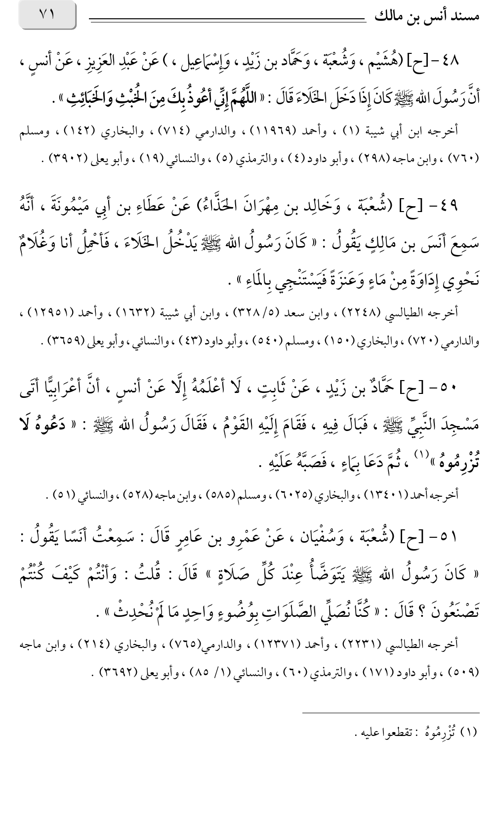 ٤٨ - [ح] (هُشَيْم، وَشُعْبَة، وَحَمَّاد بن زَيْدٍ، وَإِسْمَاعِيل، ) عَنْ عَبْدِ العَزِيزِ، عَنْ أنسٍ، أنَّ رَسُولَ الله صلى الله عليه وسلم كَانَ إِذَا دَخَلَ الخَلَاءَ قَالَ: «اللَّهُمَّ إِنِّي أعُوذُ بِكَ مِنَ الخُبْثِ وَالخَبَائِثِ».