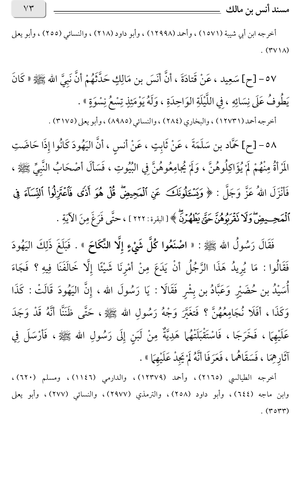 ٥٨ - [ح] حَمَّاد بن سَلَمَةَ، عَنْ ثَابِتٍ، عَنْ أنسٍ، أنَّ اليَهُودَ كَانُوا إِذَا حَاضَتِ المَرْأةُ مِنْهُمْ لَمْ يُؤَاكِلُوهُنَّ، وَلَمْ يُجامِعُوهُنَّ فِي البُيُوتِ، فَسَألَ أصْحَابُ النَّبِيِّ صلى الله عليه وسلم، فَأنْزَلَ اللهُ عَزَّ وَجَلَّ: {وَيَسْأَلُونَكَ عَنِ الْمَحِيضِ قُلْ هُوَ أَذًى فَاعْتَزِلُوا النِّسَاءَ فِي الْمَحِيضِ وَلَا تَقْرَبُوهُنَّ حَتَّى يَطْهُرْنَ} [البقرة: ٢٢٢]، حتَّى فَرَغَ مِنَ الآيَةِ.