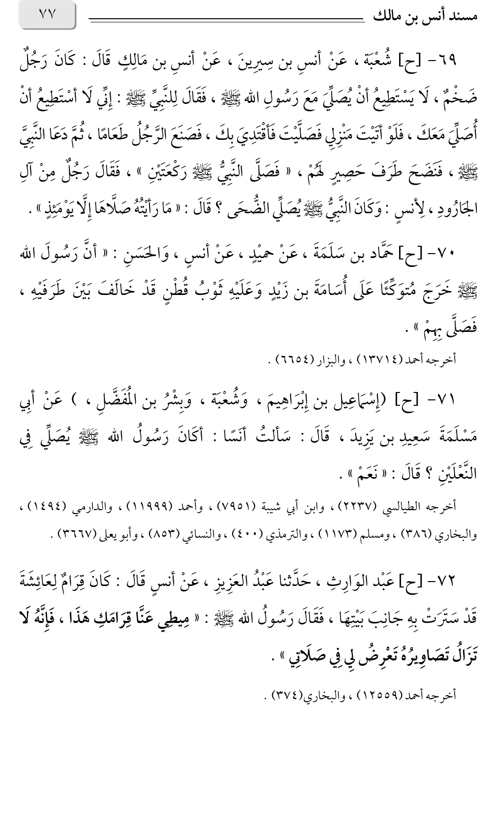٧١ - [ح] (إِسْمَاعِيل بن إِبْرَاهِيمَ، وَشُعْبَة، وَبِشْرُ بن المُفَضَّلِ، ) عَنْ أبِي مَسْلَمَةَ سَعِيدِ بن يَزِيدَ، قَالَ: سَألتُ أنَسًا: أكَانَ رَسُولُ الله صلى الله عليه وسلم يُصَلِّي فِي النَّعْلَيْنِ؟ قَالَ: «نَعَمْ».
