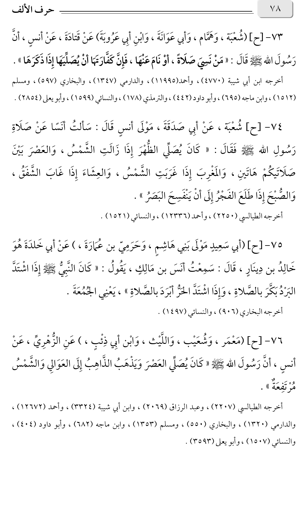 ٧٦ - [ح] (مَعْمَر، وَشُعَيْب، وَاللَّيْث، وَابْن أبِي ذِئْبٍ، ) عَنِ الزُّهْرِيِّ، عَنْ أنسٍ، أنَّ رَسُولَ الله صلى الله عليه وسلم "كَانَ يُصَلِّي العَصْرَ وَيَذْهَبُ الذَّاهِبُ إِلَى العَوَالِي وَالشَّمْسُ مُرْتَفِعَةٌ».