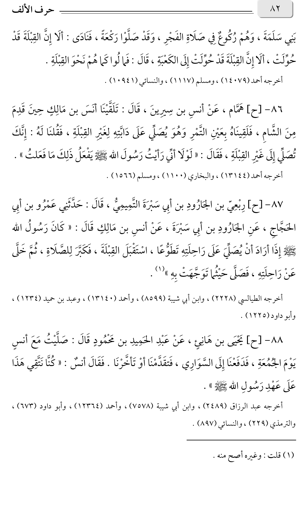 ٨٦ - [ح] هَمَّام، عَنْ أنسِ بن سِيرِينَ، قَالَ: تَلَقَّيْنَا أنَسَ بن مَالِكٍ حِينَ قَدِمَ مِنَ الشَّامِ، فَلَقِينَاهُ بِعَيْنِ التَّمْرِ وَهُوَ يُصَلِّي عَلَى دَابَّتِهِ لِغَيْرِ القِبْلَةِ، فَقُلنَا لَهُ: إِنَّكَ تُصَلِّي إِلَى غَيْرِ القِبْلَةِ، فَقَالَ: «لَوْلَا أنِّي رَأيْتُ رَسُولَ الله صلى الله عليه وسلم يَفْعَلُ ذَلِكَ مَا فَعَلتُ»