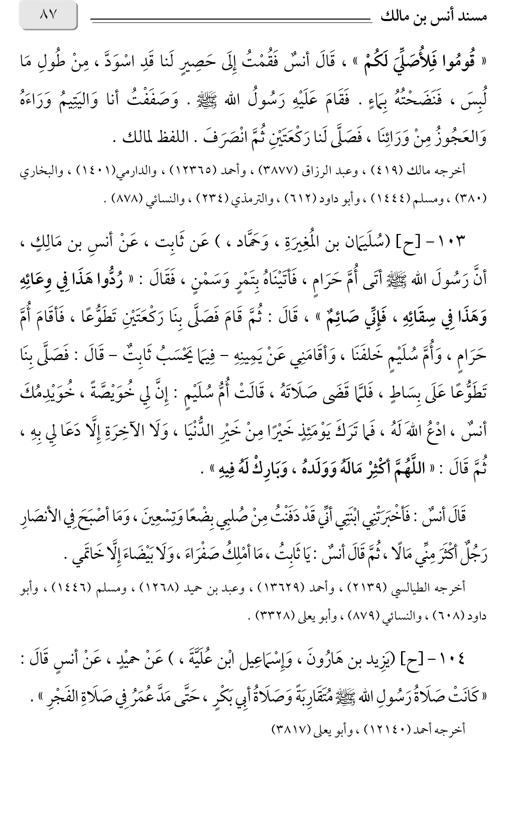 ١٠٣ - [ح] (سُلَيمَان بن المُغِيرَةِ، وَحَمَّاد، ) عَن ثَابِت، عَنْ أنسِ بن مَالِكٍ، أنَّ رَسُولَ الله صلى الله عليه وسلم أتَى أُمَّ حَرَامٍ، فَأتَيْنَاهُ بِتَمْرٍ وَسَمْنٍ، فَقَالَ: «رُدُّوا هَذَا فِي وِعَائِهِ وَهَذَا فِي سِقَائِهِ، فَإِنِّي صَائِمٌ»، قَالَ: ثُمَّ قَامَ فَصَلَّى بِنَا رَكْعَتَيْنِ تَطَوُّعًا، فَأقَامَ أُمَّ حَرَامٍ، وَأُمَّ سُلَيْمٍ خَلفَنَا، وَأقَامَنِي عَنْ يَمِينِهِ - فِيمَا يَحْسَبُ ثَابِتٌ - قَالَ: فَصَلَّى بِنَا تَطَوُّعًا عَلَى بِسَاطٍ، فَلمَّا قَضَى صَلَاتَهُ، قَالَتْ أُمُّ سُلَيْمٍ: إِنَّ لِي خُوَيْصَّةً، خُوَيْدِمُكَ أنسٌ، ادْعُ اللهَ لَهُ، فَما تَرَكَ يَوْمَئِذٍ خَيْرًا مِنْ خَيْرِ الدُّنْيَا، وَلَا الآخِرَةِ إِلَّا دَعَا لِي بِهِ، ثُمَّ قَالَ: «اللَّهُمَّ أكْثِرْ مَالَهُ وَوَلَدهُ، وَبَارِكْ لَهُ فِيهِ».