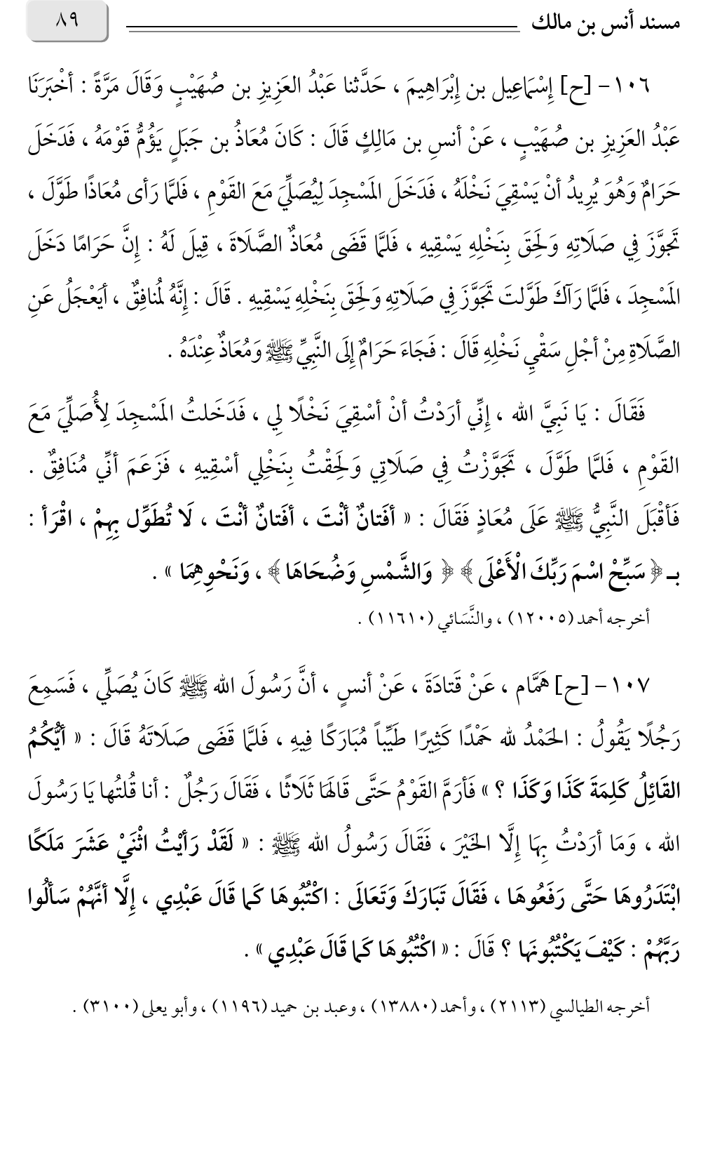 ١٠٦ - [ح] إِسْمَاعِيل بن إِبْرَاهِيمَ، حَدَّثنا عَبْدُ العَزِيزِ بن صُهَيْبٍ وَقَالَ مَرَّةً: أخْبَرَنَا عَبْدُ العَزِيزِ بن صُهَيْبٍ، عَنْ أنسِ بن مَالِكٍ قَالَ: كَانَ مُعَاذُ بن جَبَلٍ يَؤُمُّ قَوْمَهُ، فَدَخَلَ حَرَامٌ وَهُوَ يُرِيدُ أنْ يَسْقِيَ نَخْلَهُ، فَدَخَلَ المَسْجِدَ لِيُصَلِّيَ مَعَ القَوْمِ، فَلمَّا رَأى مُعَاذًا طَوَّلَ، تَجوَّزَ فِي صَلَاتِهِ وَلَحِقَ بِنَخْلِهِ يَسْقِيهِ، فَلمَّا قَضَى مُعَاذٌ الصَّلَاةَ، قِيلَ لَهُ: إِنَّ حَرَامًا دَخَلَ المَسْجِدَ، فَلمَّا رَآكَ طَوَّلتَ تَجَوَّزَ فِي صَلَاتِهِ وَلَحِقَ بِنَخْلِهِ يَسْقِيهِ. قَالَ: إِنَّهُ لمُنافِقٌ، أيَعْجَلُ عَنِ الصَّلَاةِ مِنْ أجْلِ سَقْيِ نَخْلِهِ قَالَ: فَجَاءَ حَرَامٌ إِلَى النَّبِيِّ صلى الله عليه وسلم وَمُعَاذٌ عِنْدَهُ.