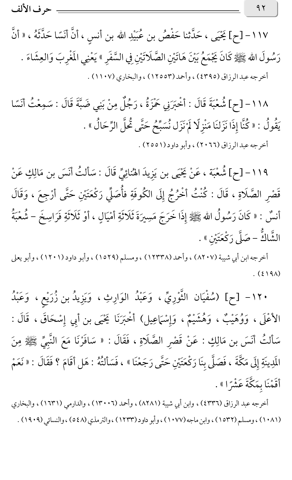١٢٠ - [ح] (سُفْيَان الثَّوْرِيِّ، وَعَبْدُ الوَارِثِ، وَيَزِيدُ بن زُرَيْعٍ، وَعَبْدُ الأعْلَى، وَوُهَيْبٌ، وَهُشَيْمٌ، وَإِسْمَاعِيل) أخْبَرَنَا يَحْيَى بن أبِي إِسْحَاقَ، قَالَ: سَألتُ أنَسَ بن مَالِكٍ: عَنْ قَصْرِ الصَّلَاةِ، فَقَالَ: «سَافَرْنَا مَعَ النَّبِيِّ صلى الله عليه وسلم مِنَ المَدِينَةِ إِلَى مَكَّةَ، فَصَلَّى بِنَا رَكْعَتَيْنِ حَتَّى رَجَعْنَا»، فَسَألتُهُ: هَل أقَامَ؟ فَقَالَ: «نَعَمْ أقَمْنَا بِمَكَّةَ عَشْرًا».