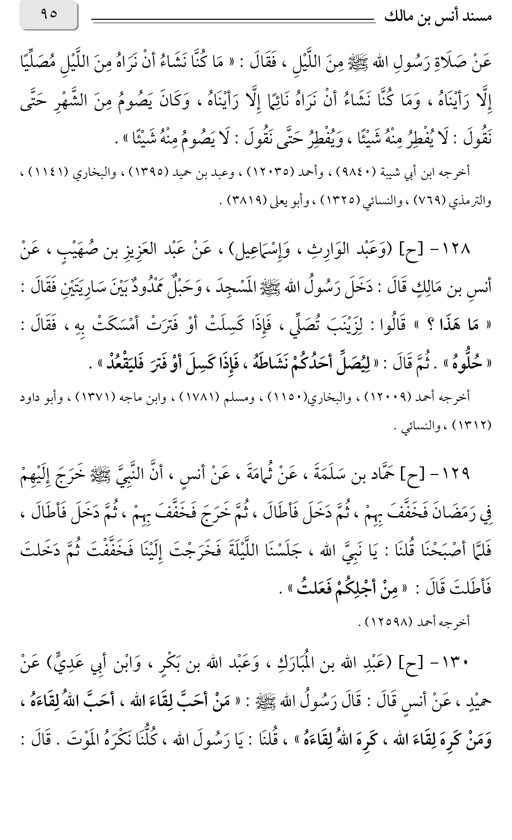 ١٣٠ - [ح] (عَبْدِ الله بن المُبَارَكِ، وَعَبْد الله بن بَكْرٍ، وَابْن أبِي عَدِيٍّ) عَنْ حميْدٍ، عَنْ أنسٍ قَالَ: قَالَ رَسُولُ الله صلى الله عليه وسلم: «مَنْ أحَبَّ لِقَاءَ الله، أحَبَّ اللهُ لِقَاءَهُ، وَمَنْ كَرِهَ لِقَاءَ الله، كَرِهَ اللهُ لِقَاءَهُ»، قُلنَا: يَا رَسُولَ الله، كُلُّنَا نَكْرَهُ المَوْتَ. قَالَ: