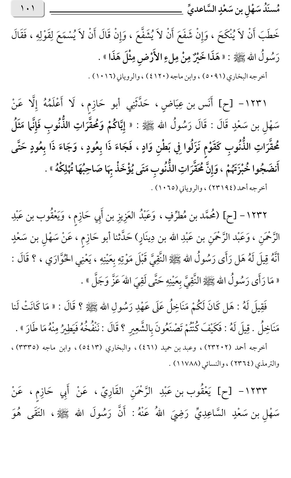 ١٢٣١ - [ح] أَنَس بن عِيَاضٍ، حَدَّثَنِي أبو حَازِمٍ، لَا أَعْلَمُهُ إِلَّا عَنْ سَهْلِ بن سَعْدٍ قَالَ: قَالَ رَسُولُ الله صلى الله عليه وسلم: «إِيَّاكُمْ وَمُحَقَّرَاتِ الذُّنُوبِ فَإِنَّما مَثَلُ مُحقَّرَاتِ الذُّنُوبِ كَقَوْمٍ نَزَلُوا فِي بَطْنِ وَادٍ، فَجَاءَ ذَا بِعُودٍ، وَجَاءَ ذَا بِعُودٍ حَتَّى أَنضَجُوا خُبْزَتَهُمْ، وَإِنَّ مُحَقَّرَاتِ الذُّنُوبِ مَتَى يُؤْخَذْ بِهَا صَاحِبُهَا تُهْلِكْهُ».