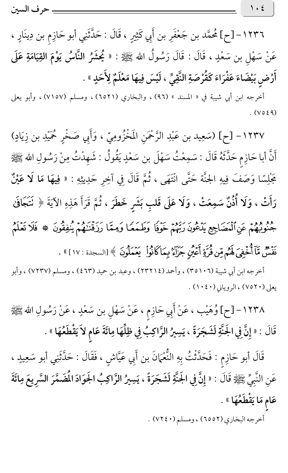 ١٢٣٧ - [ح] (سَعِيد بن عَبْدِ الرَّحْمَنِ المَخْزُومِيّ، وَأَبِي صَخْرٍ حُمَيْدِ بن زِيَادٍ) أَنَّ أبا حَازِمٍ حَدَّثَهُ قَالَ: سَمِعْتُ سَهْلَ بن سَعْدٍ يَقُولُ: شَهِدْتُ مِنْ رَسُولِ الله صلى الله عليه وسلم مَجْلِسًا وَصَفَ فِيهِ الجنَّة حَتَّى انْتَهَى، ثُمَّ قَالَ فِي آخِرِ حَدِيثِهِ: «فِيهَا مَا لَا عَيْنٌ رَأَتْ، وَلَا أُذُنٌ سَمِعَتْ، وَلَا عَلَى قَلبِ بَشَرٍ خَطَرَ، ثُمَّ قَرَأَ هَذِهِ الآيَةَ {تَتَجَافَى جُنُوبُهُمْ عَنِ الْمَضَاجِعِ يَدْعُونَ رَبَّهُمْ خَوْفًا وَطَمَعًا وَمِمَّا رَزَقْنَاهُمْ يُنْفِقُونَ (١٦) فَلَا تَعْلَمُ نَفْسٌ مَا أُخْفِيَ لَهُمْ مِنْ قُرَّةِ أَعْيُنٍ جَزَاءً بِمَا كَانُوا يَعْمَلُونَ} [السجدة: ١٦، ١٧]».