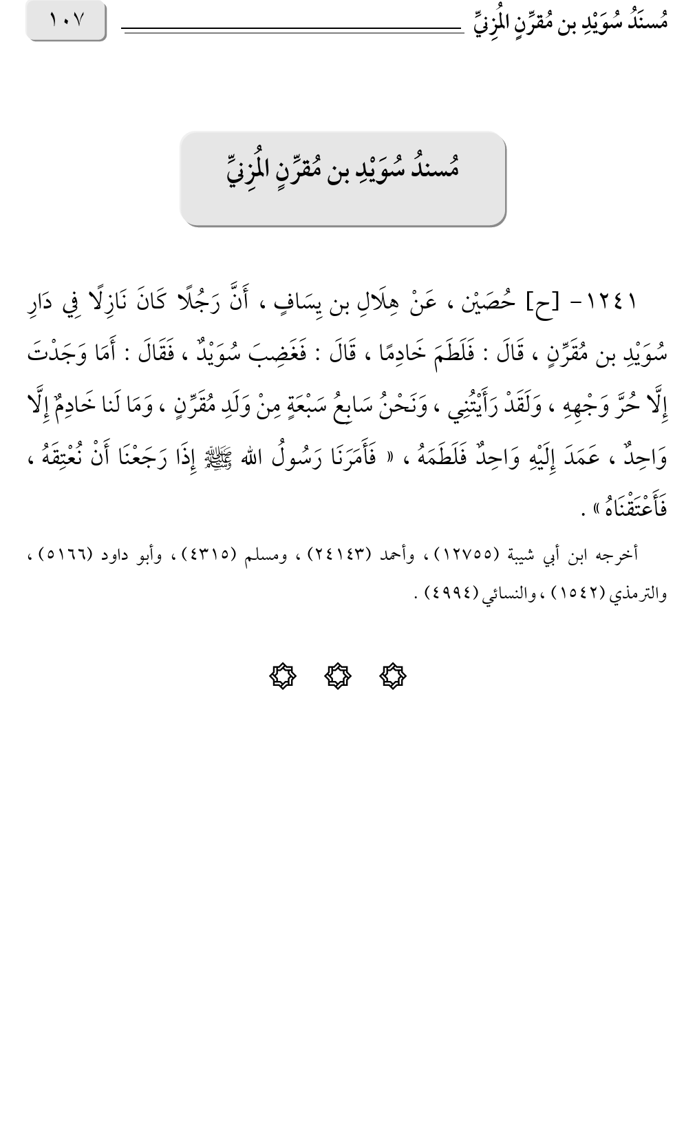 ١٢٤١ - [ح] حُصَيْن، عَنْ هِلَالِ بن يِسَافٍ، أَنَّ رَجُلًا كَانَ نَازِلًا فِي دَارِ سُوَيْدِ بن مُقَرِّنٍ، قَالَ: فَلَطَمَ خَادِمًا، قَالَ: فَغَضِبَ سُوَيْدٌ، فَقَالَ: أَمَا وَجَدْتَ إِلَّا حُرَّ وَجْهِهِ، وَلَقَدْ رَأَيْتُنِي، وَنَحْنُ سَابِعُ سَبْعَةٍ مِنْ وَلَدِ مُقَرِّنٍ، وَمَا لَنا خَادِمٌ إِلَّا، وَاحِدٌ، عَمَدَ إِلَيْهِ وَاحِدٌ فَلَطَمَهُ «فَأَمَرَنَا رَسُولُ الله صلى الله عليه وسلم إِذَا رَجَعْنَا أَنْ نُعْتِقَهُ، فَأَعْتَقْنَاهُ».