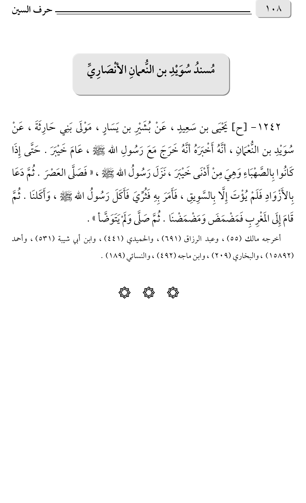 ١٢٤٢ - [ح] يَحْيَى بن سَعِيدٍ، عَنْ بُشَيْرِ بن يَسَارٍ، مَوْلَى بَنِي حَارِثَةَ، عَنْ سُوَيْدِ بن النُّعْمَانِ، أنَّهُ أَخْبَرَهُ أنَّهُ خَرَجَ مَعَ رَسُولِ الله صلى الله عليه وسلم، عَامَ خَيْبَرَ. حَتَّى إِذَا، كَانُوا بِالصَّهْبَاءِ وَهِيَ مِنْ أَدْنَى خَيْبَرَ، نَزَلَ رَسُولُ الله صلى الله عليه وسلم «فَصَلَّى العَصْرَ. ثُمَّ دَعَا بِالأَزْوَادِ فَلَمْ يُؤْتَ إِلَّا بِالسَّوِيقِ، فَأَمَرَ بِهِ فَثُرِّيَ فَأَكَلَ رَسُولُ الله صلى الله عليه وسلم، وَأَكَلنَا. ثُمَّ قَامَ إِلَى المَغْرِبِ فَمَضْمَضَ وَمَضْمَضْنَا. ثُمَّ صَلَّى وَلَمْ يَتَوَضَّأ».