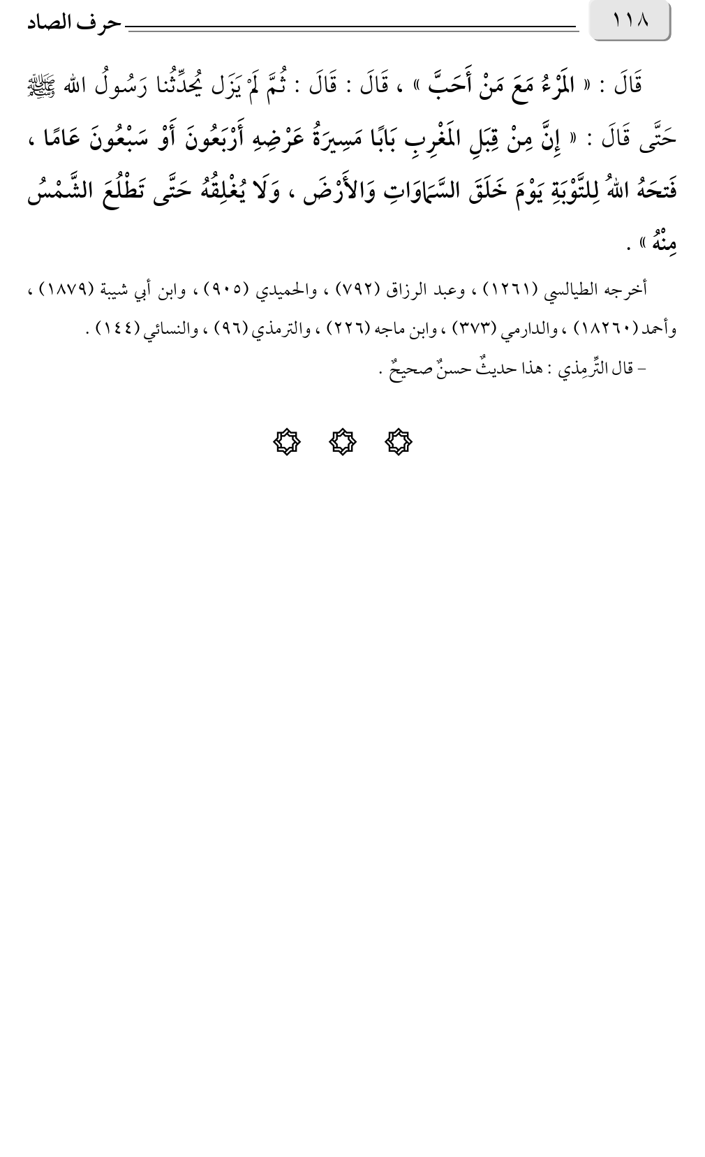 قَالَ: «المَرْءُ مَعَ مَنْ أَحَبَّ» قَالَ: قَالَ: ثُمَّ لَمْ يَزَل يُحدِّثُنا رَسُولُ الله صلى الله عليه وسلم، حَتَّى قَالَ: «إِنَّ مِنْ قِبَلِ المَغْرِبِ بَابًا مَسِيرَةُ عَرْضِهِ أَرْبَعُونَ أَوْ سَبْعُونَ عَامًا، فَتحَهُ اللهُ لِلتَّوْبَةِ يَوْمَ خَلَقَ السَّمَاوَاتِ وَالأَرْضَ، وَلَا يُغْلِقُهُ حَتَّى تَطْلُعَ الشَّمْسُ مِنْهُ».
