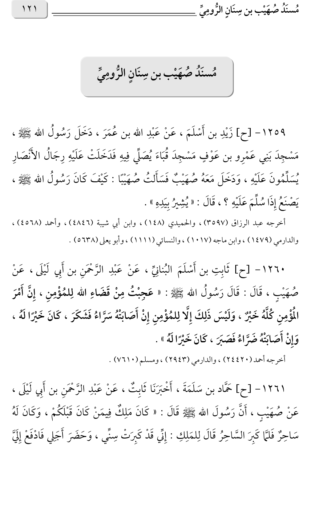 ١٢٦١ - [ح] حَمَّاد بن سَلَمَةَ، أَخْبَرَنَا ثَابِتٌ، عَنْ عَبْدِ الرَّحْمَنِ بن أَبِي لَيْلَى، عَنْ صُهَيْبٍ، أَنَّ رَسُولَ الله صلى الله عليه وسلم قَالَ: «كَانَ مَلِكٌ فِيمَنْ كَانَ قَبْلَكُمْ، وَكَانَ لَهُ سَاحِرٌ فَلمَّا كَبِرَ السَّاحِرُ قَالَ لِلمَلِكِ: إِنِّي قَدْ كَبِرَتْ سِنِّي، وَحَضَرَ أَجَلي فَادْفَعْ إِلَيَّ مُسنَدُ صُهَيْب بن سِنَانٍ الرُّومِيِّ