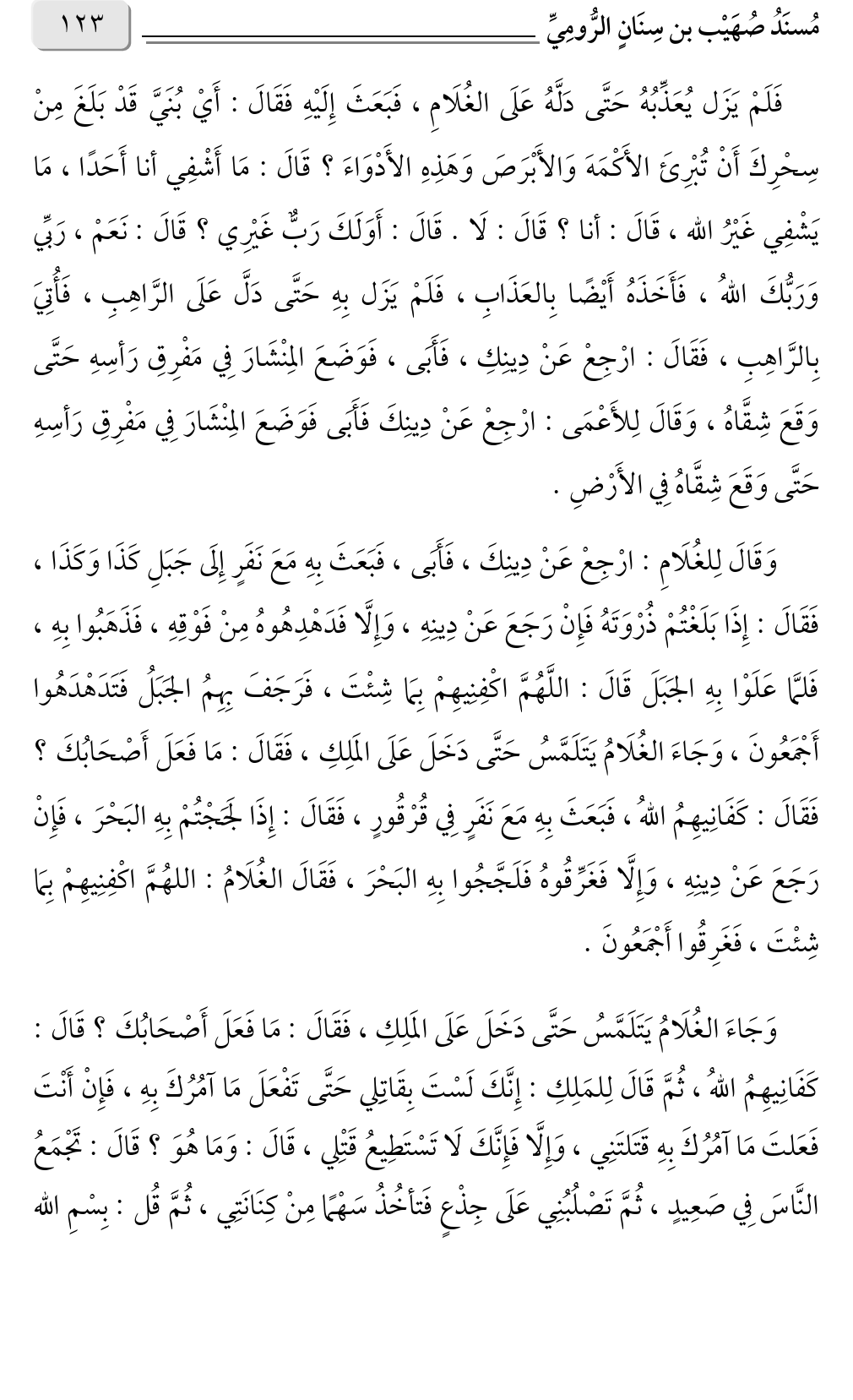 فَلَمْ يَزَل يُعَذِّبُهُ حَتَّى دَلَّهُ عَلَى الغُلَامِ، فَبَعَثَ إِلَيْهِ فَقَالَ: أَيْ بُنَيَّ قَدْ بَلَغَ مِنْ سِحْرِكَ أَنْ تُبْرِئَ الأَكْمَهَ وَالأَبْرَصَ وَهَذِهِ الأَدْوَاءَ؟ قَالَ: مَا أَشْفِي أنا أَحَدًا، مَا يَشْفِي غَيْرُ الله، قَالَ: أنا؟ قَالَ: لَا. قَالَ: أَوَلَكَ رَبٌّ غَيْرِي؟ قَالَ: نَعَمْ، رَبِّي وَرَبُّكَ اللهُ، فَأَخَذَهُ أَيْضًا بِالعَذَابِ، فَلَمْ يَزَل بِهِ حَتَّى دَلَّ عَلَى الرَّاهِبِ، فَأُتِيَ بِالرَّاهِبِ، فَقَالَ: ارْجِعْ عَنْ دِينِكِ، فَأَبَى، فَوَضَعَ المِنْشَارَ فِي مَفْرِقِ رَأسِهِ حَتَّى وَقَعَ شِقَّاهُ، وَقَالَ لِلأَعْمَى: ارْجِعْ عَنْ دِينِكَ فَأَبَى فَوَضَعَ المِنْشَارَ فِي مَفْرِقِ رَأسِهِ حَتَّى وَقَعَ شِقَّاهُ فِي الأَرْضِ.