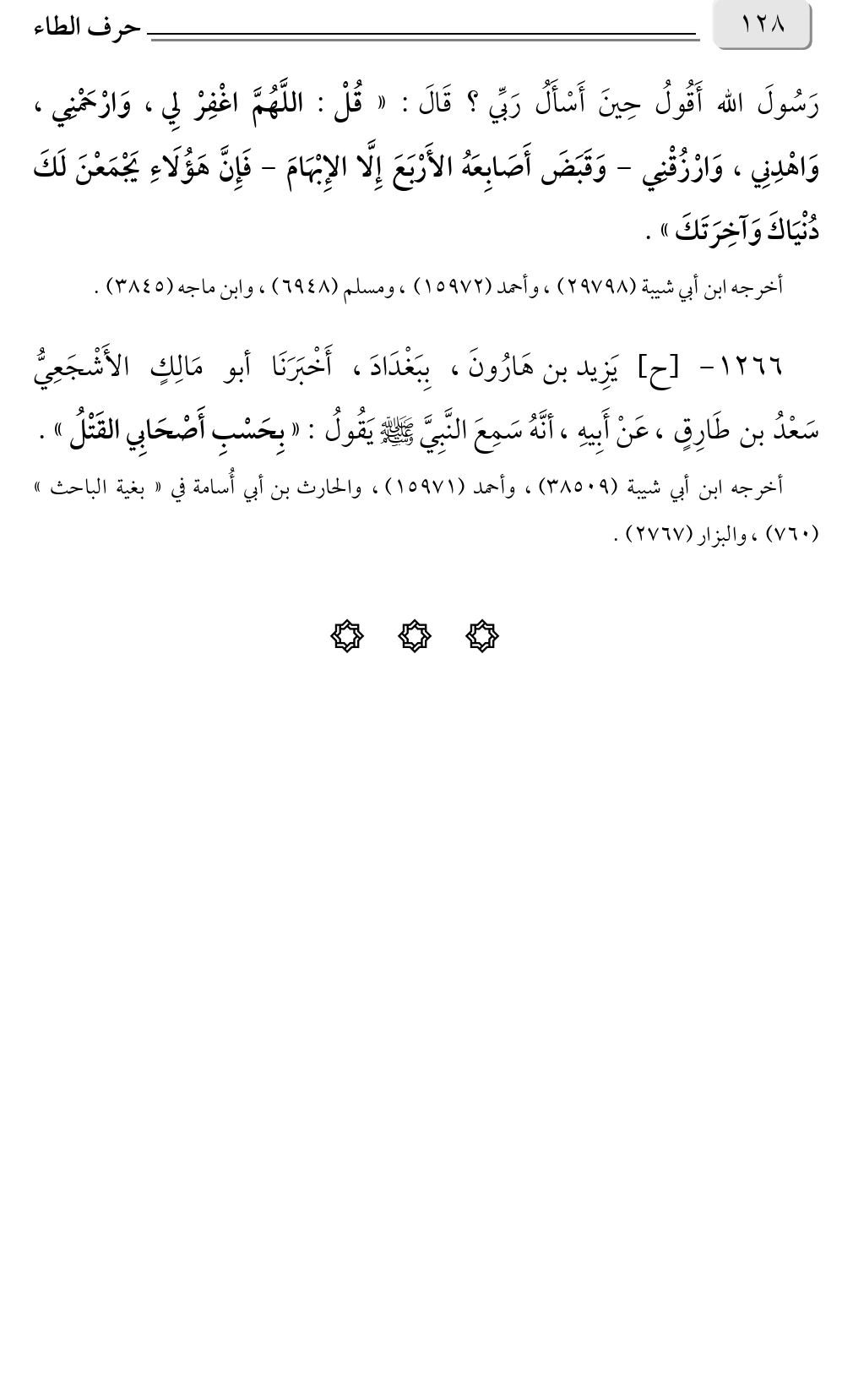 ١٢٦٦ - [ح] يَزِيد بن هَارُونَ، بِبَغْدَادَ، أَخْبَرَنَا أبو مَالِكٍ الأَشْجَعِيُّ سَعْدُ بن طَارِقٍ، عَنْ أَبِيهِ، أنَّهُ سَمِعَ النَّبِيَّ صلى الله عليه وسلم يَقُولُ: «بِحَسْبِ أَصْحَابِي القَتْلُ».