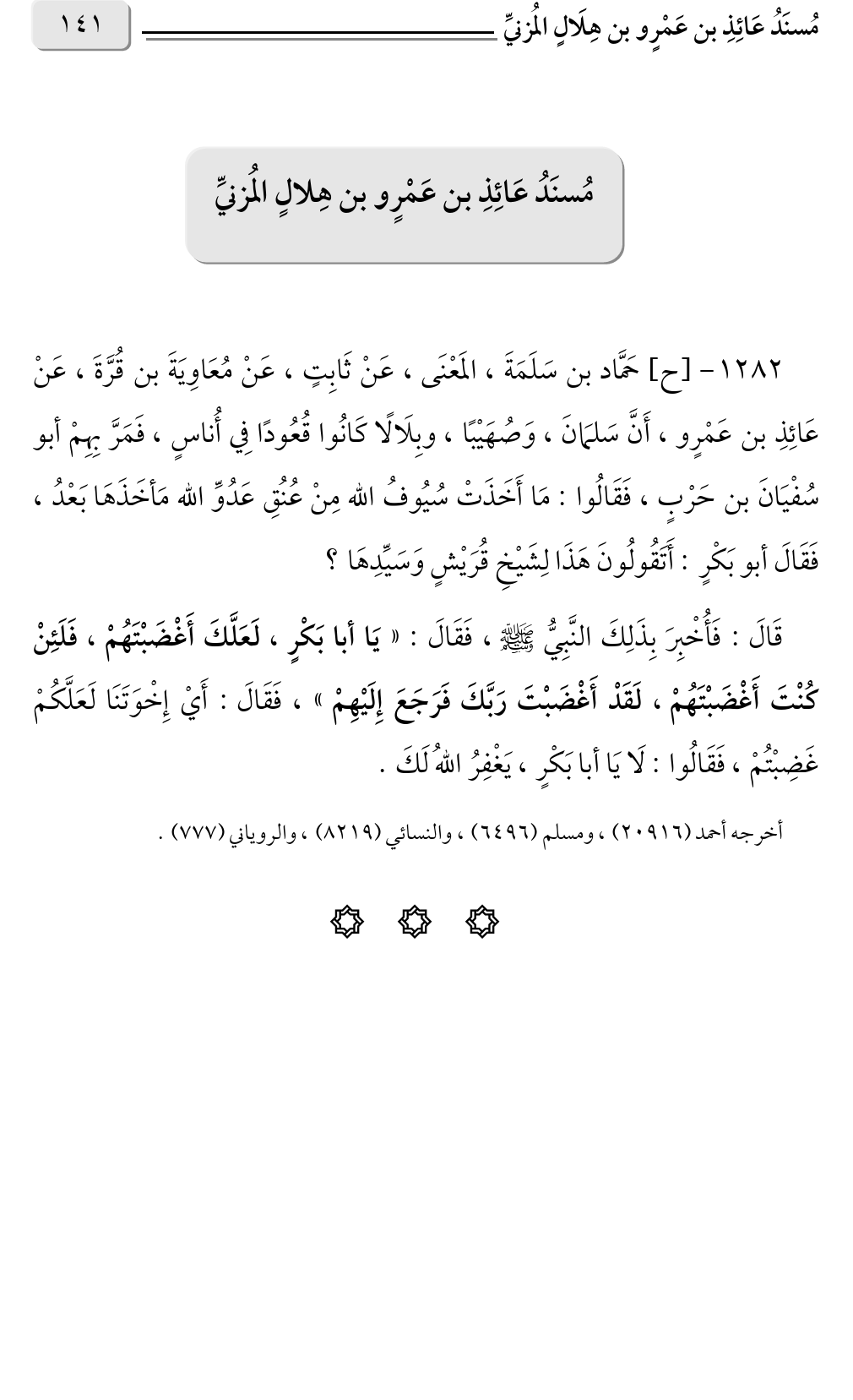 ١٢٨٢ - [ح] حَمَّاد بن سَلَمَةَ، المَعْنَى، عَنْ ثَابِتٍ، عَنْ مُعَاوِيَةَ بن قُرَّةَ، عَنْ عَائِذِ بن عَمْرٍو، أَنَّ سَلمَانَ، وَصُهَيْبًا، وبِلَالًا كَانُوا قُعُودًا فِي أُناسٍ، فَمَرَّ بِهِمْ أبو سُفْيَانَ بن حَرْبٍ، فَقَالُوا: مَا أَخَذَتْ سُيُوفُ الله مِنْ عُنُقِ عَدُوِّ الله مَأخَذَهَا بَعْدُ، فَقَالَ أبو بَكْرٍ: أَتَقُولُونَ هَذَا لِشَيْخِ قُرَيْشٍ وَسَيِّدِهَا؟