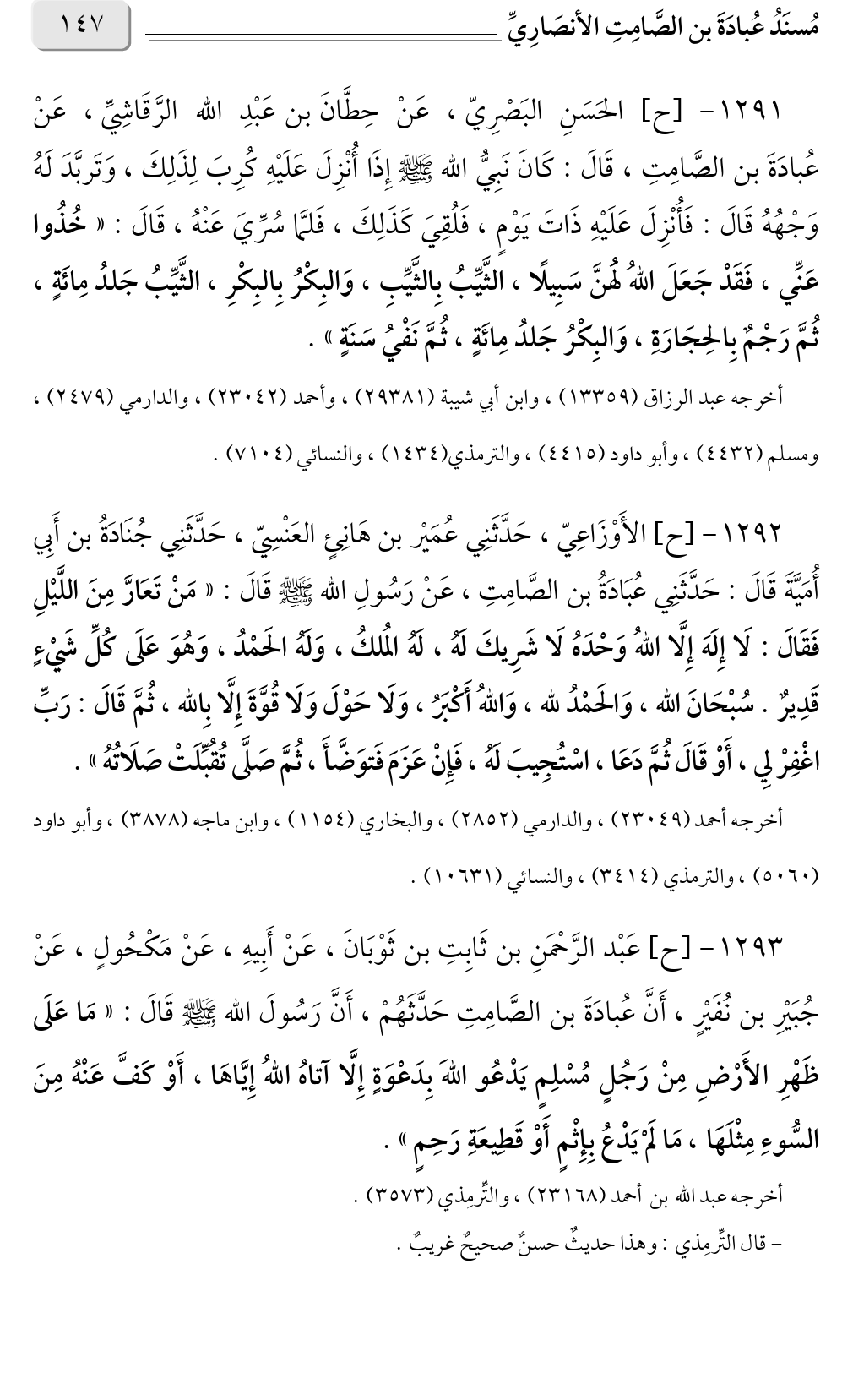 ١٢٩١ - [ح] الحَسَنِ البَصْرِيّ، عَنْ حِطَّانَ بن عَبْدِ الله الرَّقَاشِيِّ، عَنْ عُبادَةَ بن الصَّامِتِ، قَالَ: كَانَ نَبِيُّ الله صلى الله عليه وسلم إِذَا أُنْزِلَ عَلَيْهِ كُرِبَ لِذَلِكَ، وَتَربَّدَ لَهُ وَجْهُهُ قَالَ: فَأُنْزِلَ عَلَيْهِ ذَاتَ يَوْمٍ، فَلُقِيَ كَذَلِكَ، فَلمَّا سُرِّيَ عَنْهُ، قَالَ: «خُذُوا عَنِّي، فَقَدْ جَعَلَ اللهُ لهُنَّ سَبِيلًا، الثَّيِّبُ بِالثَّيِّبِ، وَالبِكْرُ بِالبِكْرِ، الثَّيِّبُ جَلدُ مِائَةٍ، ثُمَّ رَجْمٌ بِالحِجَارَةِ، وَالبِكْرُ جَلدُ مِائَةٍ، ثُمَّ نَفْيُ سَنَةٍ».