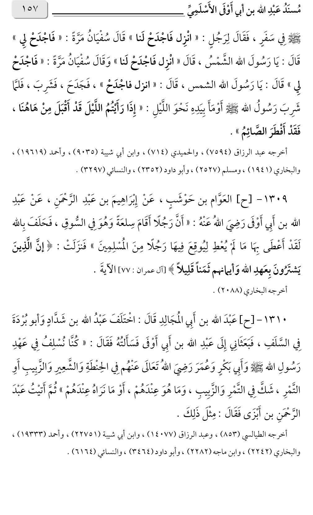 ١٣١٠ - [ح] عَبْدَ الله بن أَبِي المُجَالِدِ قَالَ: اخْتَلَفَ عَبْدُ الله بن شَدَّادٍ وَأبو بُرْدَةَ فِي السَّلَفِ، فَبَعَثَانِي إِلَى عَبْدِ الله بن أَبِي أَوْفَى فَسَأَلتُهُ فَقَالَ: «كُنَّا نُسْلِفُ فِي عَهْدِ رَسُولِ الله صلى الله عليه وسلم وَأَبِي بَكْرٍ وَعُمَرَ رَضِيَ اللهُ تَعَالَى عَنْهُم فِي الحِنْطَةِ وَالشَّعِيرِ وَالزَّبِيبِ أَوِ التَّمْرِ، شَكَّ فِي التَّمْرِ وَالزَّبِيبِ، وَمَا هُوَ عِنْدَهُمْ، أَوْ مَا نَرَاهُ عِنْدَهُمْ» ثُمَّ أَتيْتُ عَبْدَ الرَّحْمَنِ بن أَبْزَى فَقَالَ: مِثْلَ ذَلِكَ.