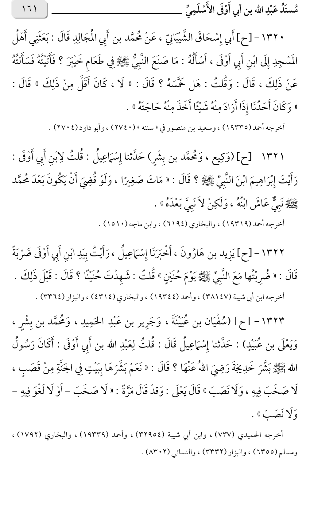 ١٣٢١ - [ح] (وَكِيع، وَمُحمَّد بن بِشْرٍ) حَدَّثنا إِسْمَاعِيلُ: قُلتُ لِابْنِ أَبِي أَوْفَى: رَأَيْتَ إِبْرَاهِيمَ ابْنَ النَّبِيِّ صلى الله عليه وسلم؟ قَالَ: «مَاتَ صَغِيرًا، وَلَوْ قُضِيَ أَنْ يَكُونَ بَعْدَ مُحمَّد صلى الله عليه وسلم نَبِيٌّ عَاشَ ابْنُهُ، وَلَكِنْ لا نَبِيَّ بَعْدَهُ».