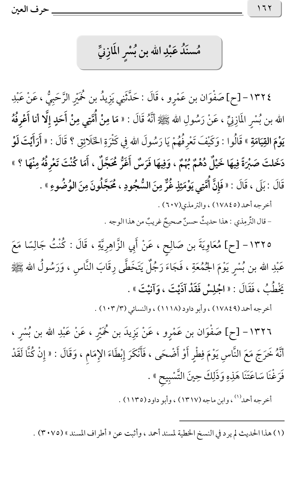 ١٣٢٤ - [ح] صَفْوَان بن عَمْرٍو، قَالَ: حَدَّثَنِي يَزِيدُ بن خُمَيْرٍ الرَّحَبِيُّ، عَنْ عَبْدِ الله بن بُسْرٍ المَازِنِيِّ، عَنْ رَسُولِ الله صلى الله عليه وسلم أنَّهُ قَالَ: «مَا مِنْ أُمَّتِي مِنْ أَحَدٍ إِلَّا أنا أَعْرِفُهُ يَوْمَ القِيَامَةِ» قَالُوا: وَكَيْفَ تَعْرِفُهُمْ يَا رَسُولَ الله فِي كَثْرَةِ الخَلَائِقِ؟ قَالَ: «أَرَأَيْتَ لَوْ دَخَلتَ صَبْرَةً فِيهَا خَيْلٌ دُهْمٌ بُهْمٌ، وَفِيهَا فَرَسٌ أَغَرُّ مُحَجَّلٌ، أَمَا كُنْتَ تَعْرِفُهُ مِنْهَا؟ » قَالَ: بَلَى، قَالَ: «فَإِنَّ أُمَّتِي يَوْمَئِذٍ غُرٌّ مِنَ السُّجُودِ، مُحَجَّلُونَ مِنَ الوُضُوءِ».